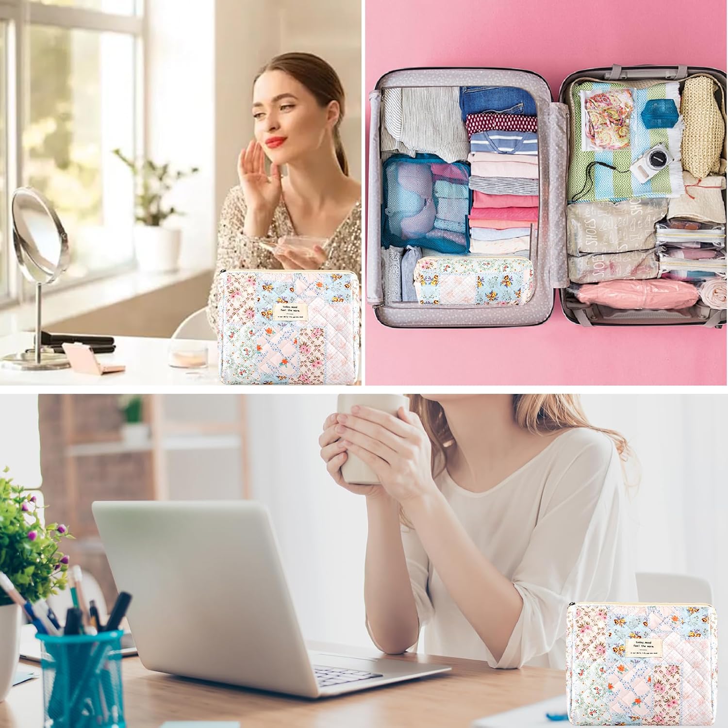 - TRAVEL MAKEUP BAG SET COQUETTE FOR WOMEN: You will get a large makeup bag and a small cosmetic bag (makeup brush bag).These floral makeup pouch is lovely and fashionable, the texture is lightweight and soft. These floral makeup pouch is cute and fashionable, lightweight and soft, easy to carry.Cute quilt makeup bag set,Floral toiletry bag small for women,Cute cosmetic bag set.