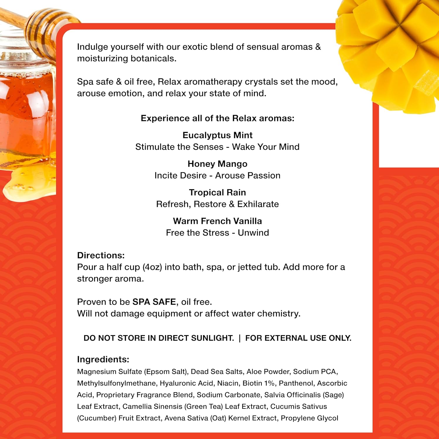 - HONEY MANGO AROMATHERAPY: This honey mango blend offers a sweet, sun-warmed scent that’s both energizing and indulgent—perfect for hot tubs and spas that crave something vibrant and elevated. Crafted with premium aromatherapy bath salts for a standout soak.
