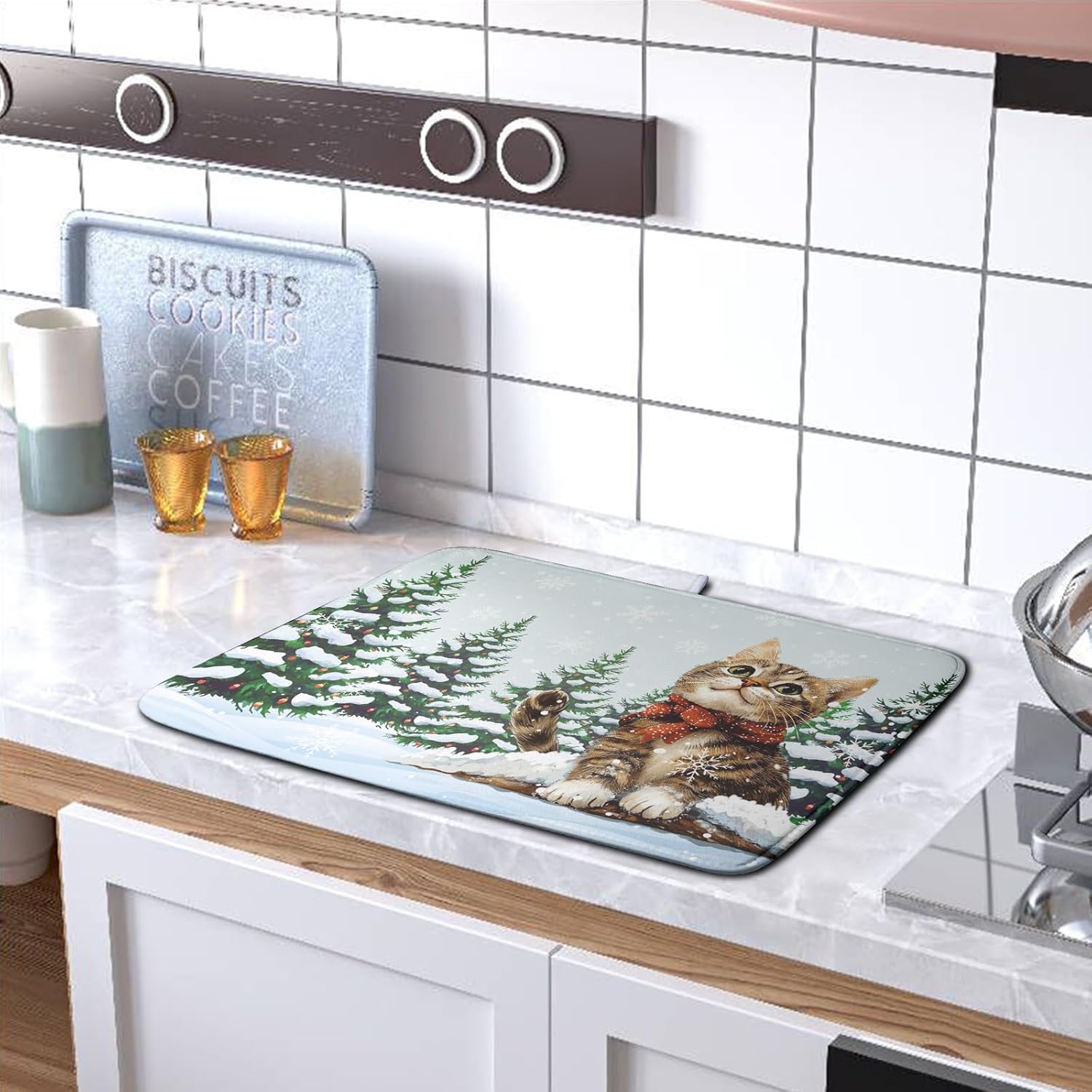 - Perfect Dimension: The winter pine tree drying mat for kitchen counter size 18x24 inch, fits most counters. The kitten dish mat is soft pliable material easily rolls or folds up for storage, simply fold up and toss in a drawer or tuck it elsewhere when not in use, does not take up space