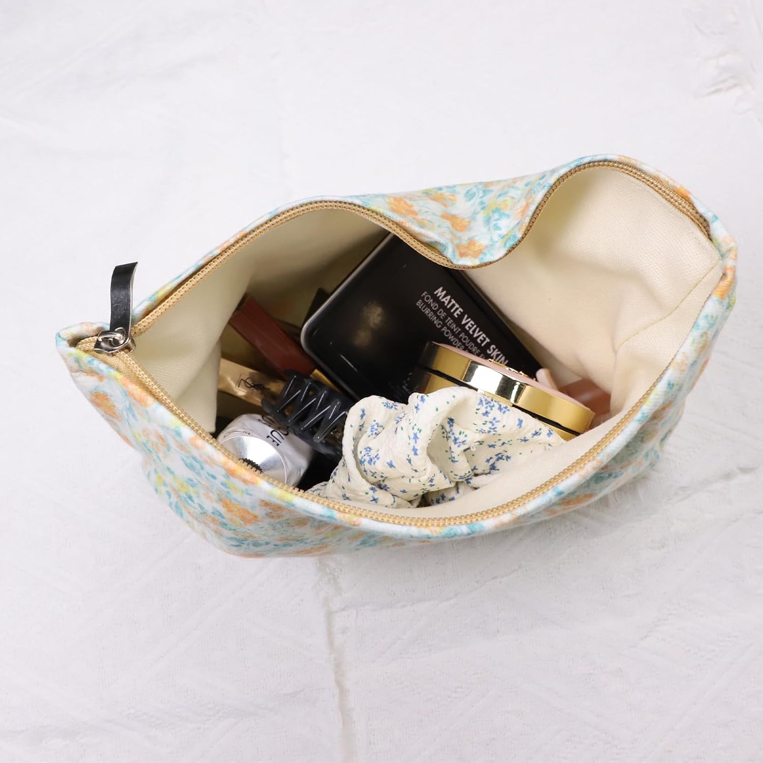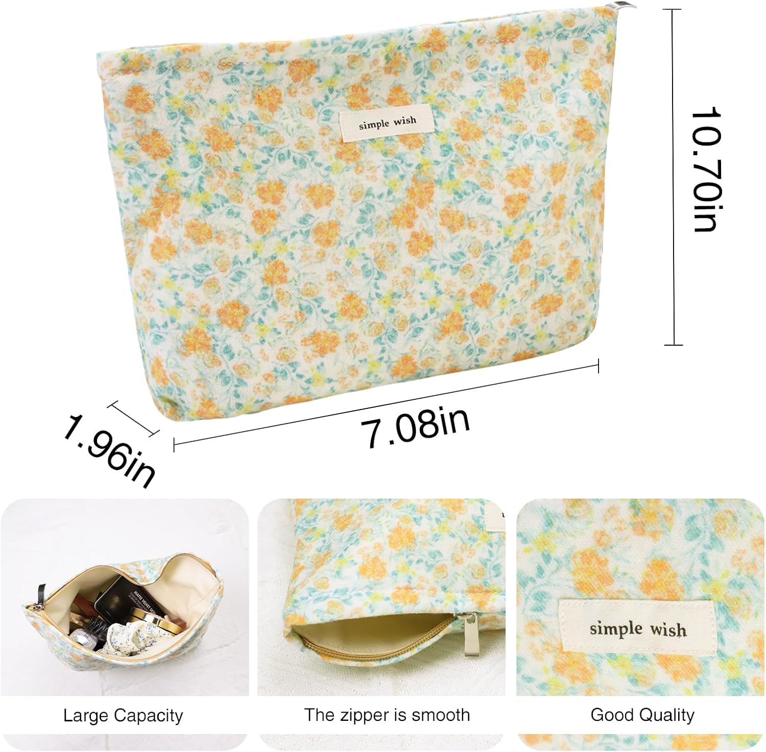 Wudygirl Aesthetic Cosmetic Bag Travel Toiletry Bag Makeup Bag Canvas Makeup Pouch Toiletry Bag for Women Large Capacity Makeup Bag Floral Pencil Pouch with Zipper (Yellow Floral)