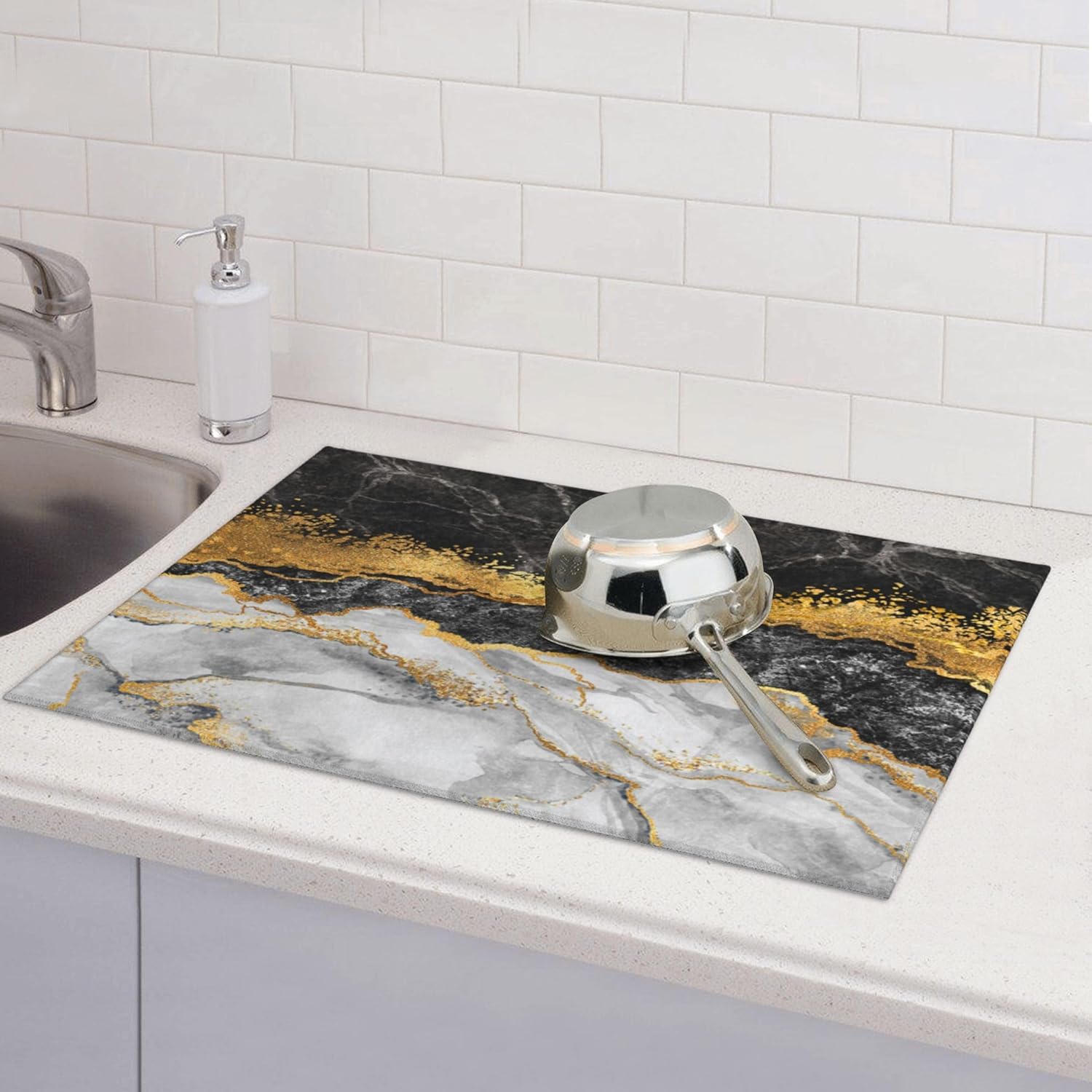 Gold and Black Grey Kitchen Drying Mat Black Gold Marble Decor Microfiber Dish Drainer Mat for Kitchen Counter Absorbent Reusable Washable 18x24 Inch