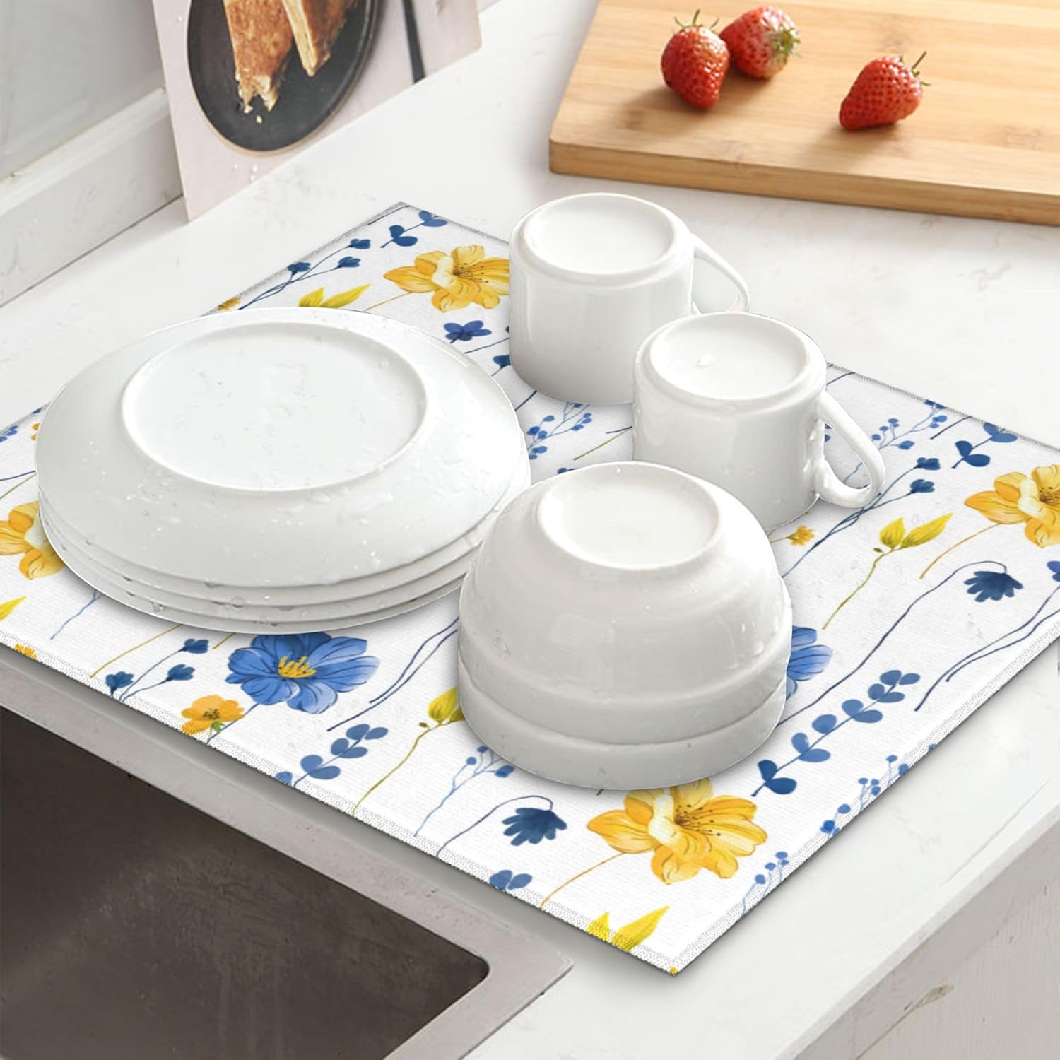 Navy Blue Yellow Flower Dish Drying Mat for Kitchen Counter Watercolor Floral Decorative Dish Drainer Rack Mats 16"x18" Absorbent Reversible Drying Pad