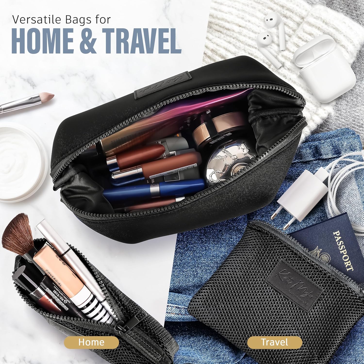 Kat Myhr Neoprene Washable Travel Makeup & Cosmetic Bag Set, 2 Air Mesh Pouches,100% Neoprene Toiletry Bag, Large Water Resistant Travel Bag for Toiletries, Makeup Cosmetic Travel Bag (Jet Black)