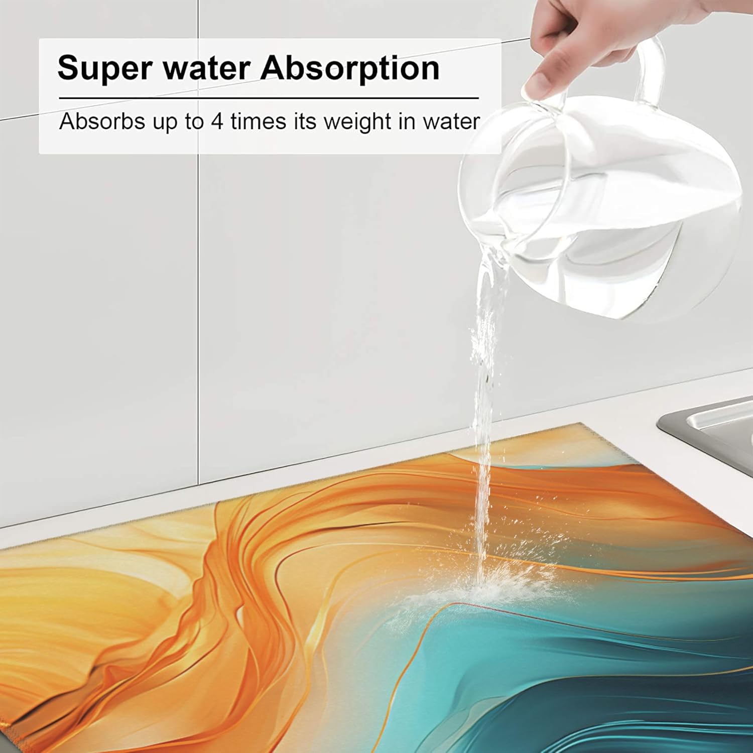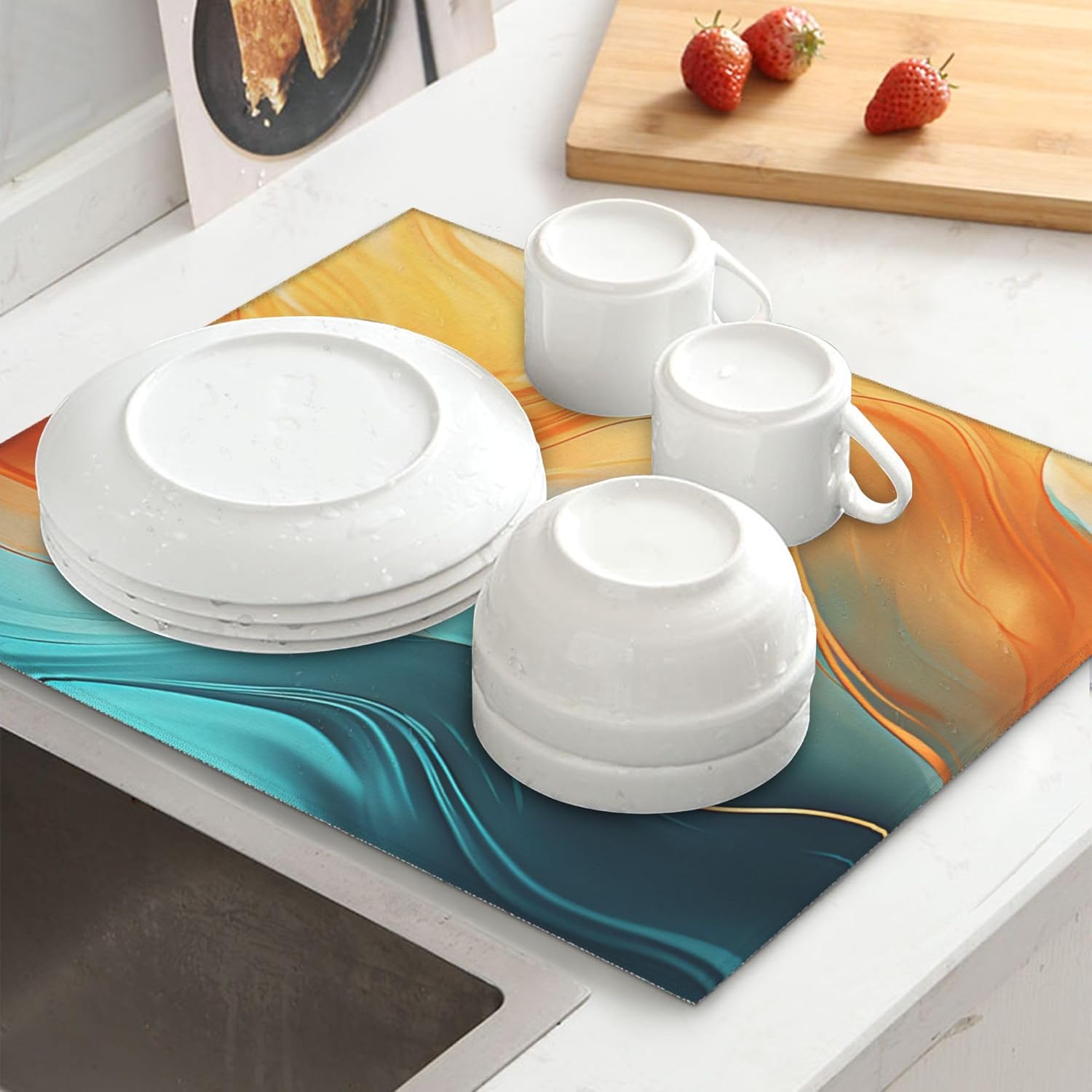 Orange Teal Marble Dish Drying Mat for Kitchen Counter Washable Absorbent Reversible Microfiber Modern Drying Pad Kitchen Accessories 16x18 Inch