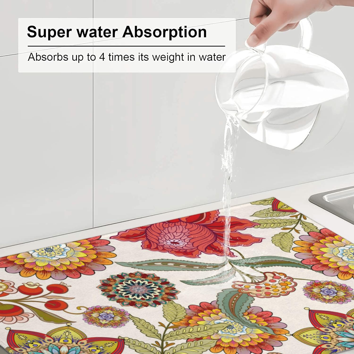 Boho Floral Dish Drying Mat for Kitchen Counter 18"x24" Colorful Decorative Dishes Pad Dish Drainer Rack Mats Microfiber Washable Absorbent Kitchen Decor, Flower