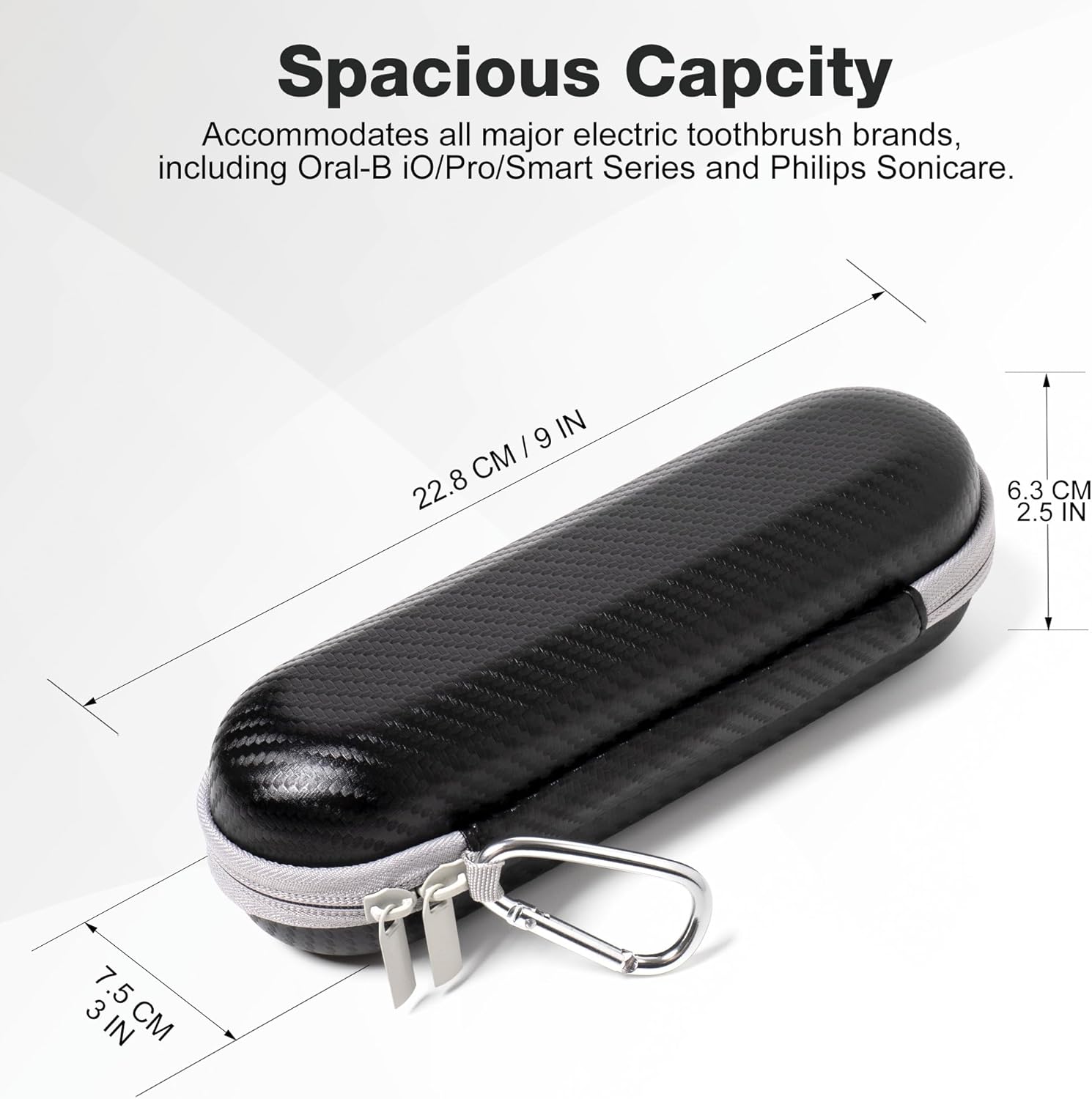 - Spacious Capacity: This toothbrush case boasts a larger size, accommodating all powered toothbrush products—including Oral-B iO, Pro, Smart Series, and Philips Sonicare. Its spacious design is perfect for storing your powered toothbrush, especially when you need to pack the iO series charger for travel. There's also ample room for extra brush heads, small toothpaste tubes, and mouthwash. If you prefer a more compact option, check out our smaller size below.