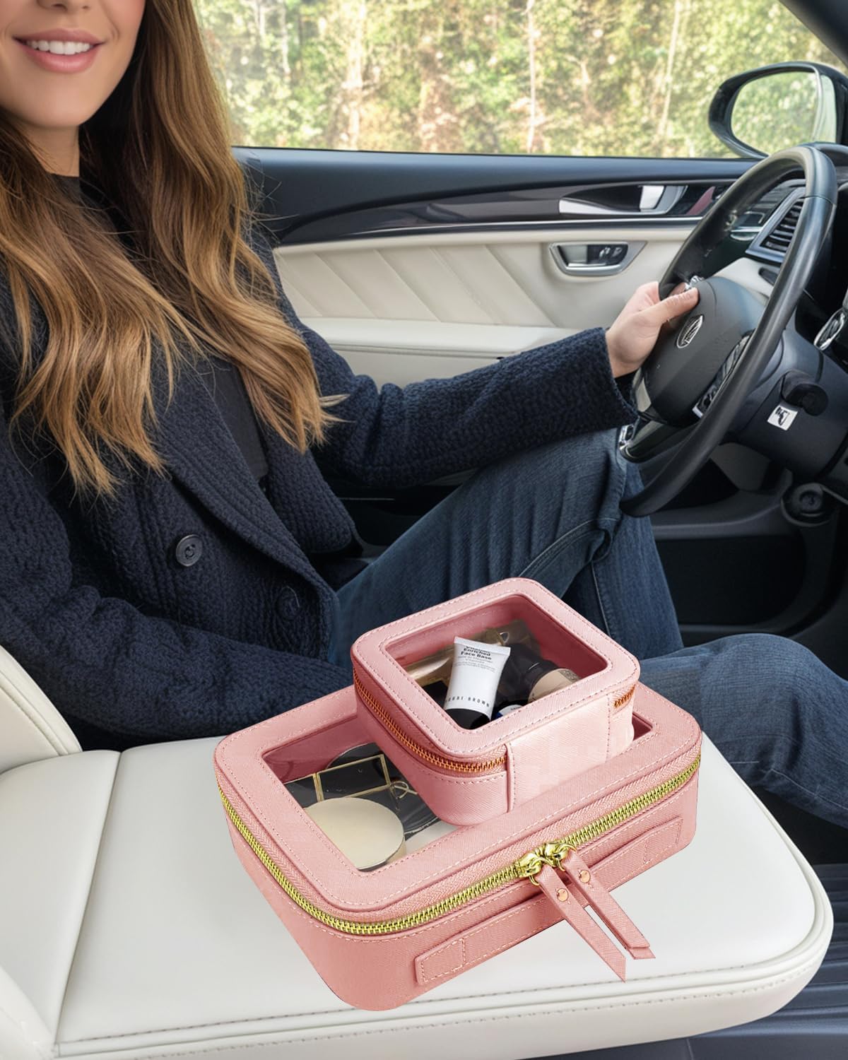 - Clear Design: Our 2Pcs Travel Makeup Bag is elegant ,and stylish, this makeup travel organizer was designed in a minimalist boxy shape,is sleek and minimalistic look for your makeup accessories collection. And is designed with a transparent PVC window,all items are clear at a glance, and you can quickly choose the cosmetics you need.Portable and lightweight Slip it into your purse, backpack, everyday tote or travelling bag for easy access to your must-have items. Large Size:8.1'' x 6.1'' x2.5'', Mini Size:5.1'' x 4.8''x 2''.