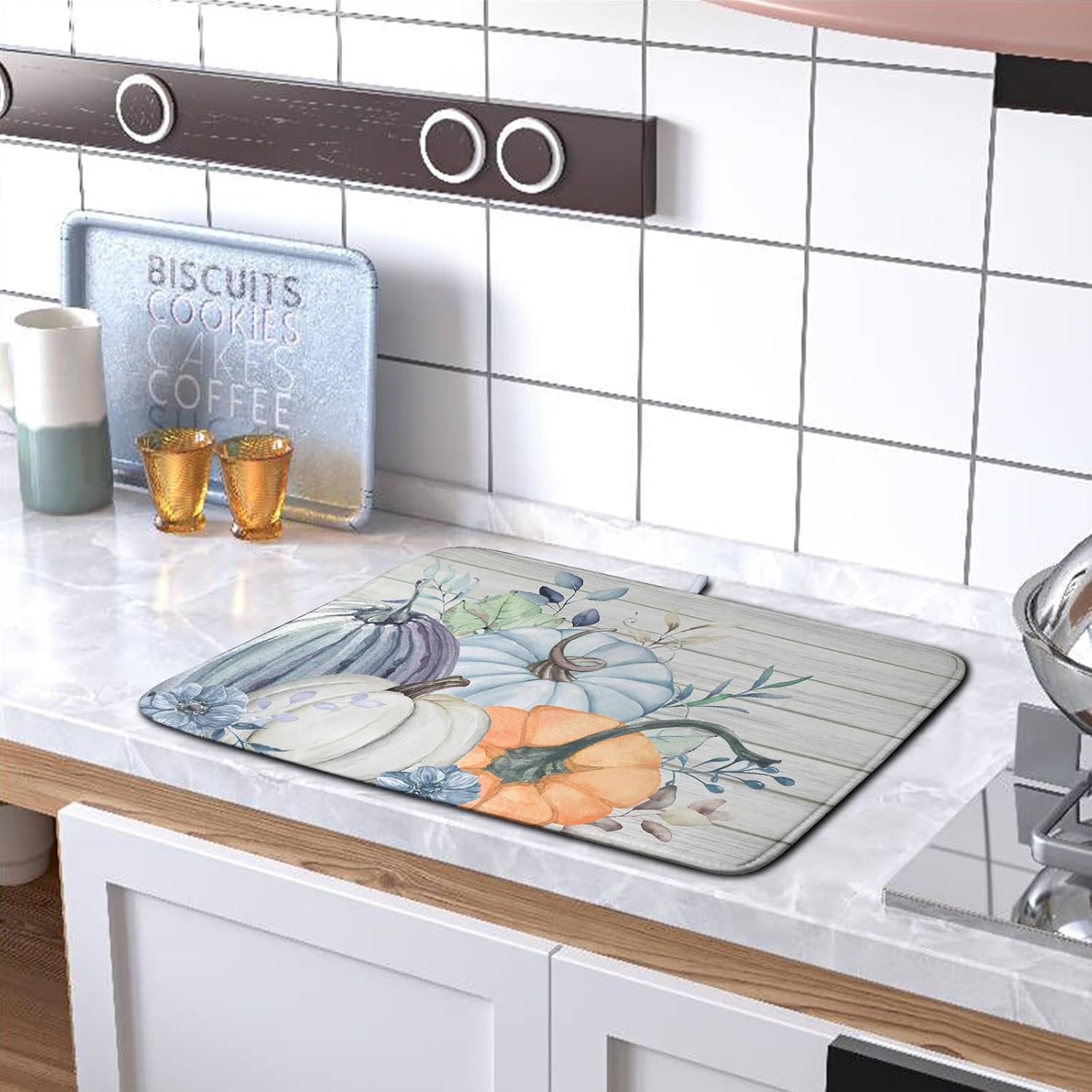 Fall Blue Orange Grey Pumpkin Kitchen Dish Drying Mat for Kitchen Counter 18x24 Inch Autumn Teal Flowers Drying Mat Thanksgiving Harvest Dish Drainer Mat Super Absorbent Dish Rack Pad for Coffee Bar