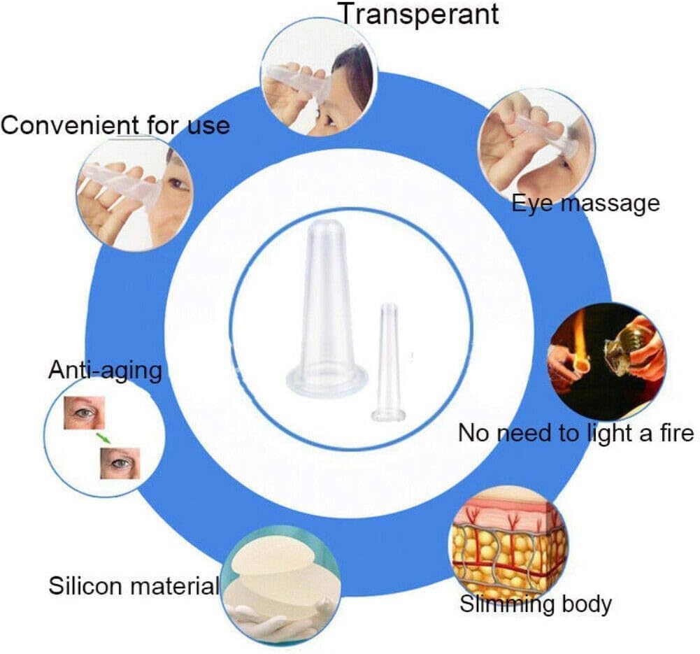 - Portable Massage Cupping Set: Includes 4 transparent silicone cups (2 small, 2 large) for facial massage and body cupping therapy.