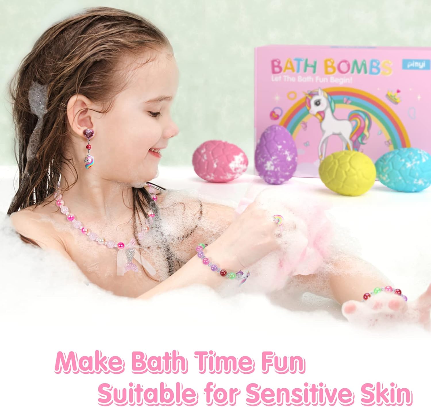- 【Bath Bombs with Surprise Jewelry Inside】Each bath bombs for kids contains a mermaid or unicorn themed jewelry inside. The jewelry includes 3 adjustable rings, 3 pairs of clip-on earrings, 3 bracelets, and each gift set comes with a necklace, totally 13 pcs jewelries. Our jewelry are made of safe material and do not cause choking hazard. Girls will get a full set of jewelry gift, and both mermaids and unicorns are favorites of the girls. It’s a magic token that turns a girl into a princess.