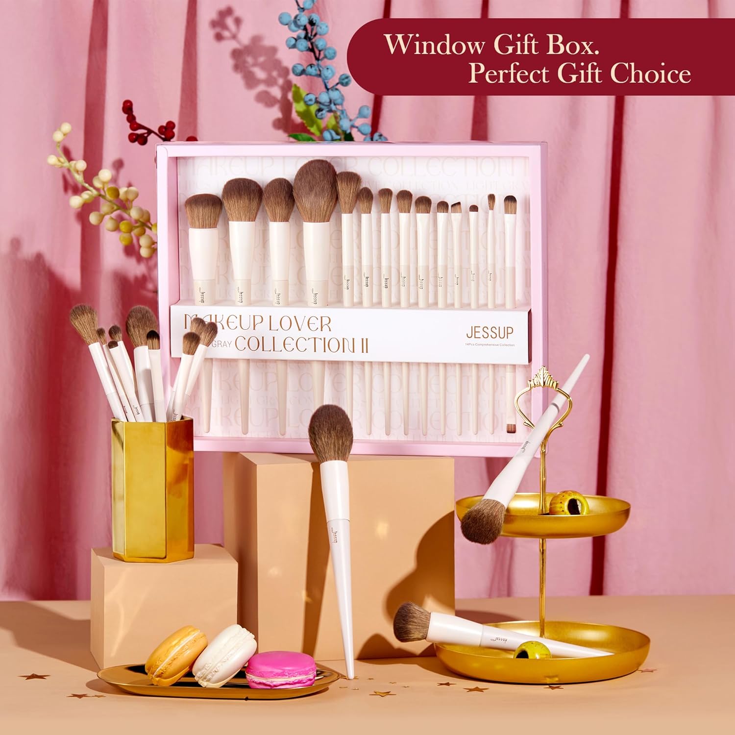 Jessup Makeup Brushes 14Pcs Makeup Brush Set Premium Synthetic Powder Foundation Contour Blush Concealer Eye Shadow Blending Liner Make Up Brush Kit Light Grey with Gift Box, T329-G