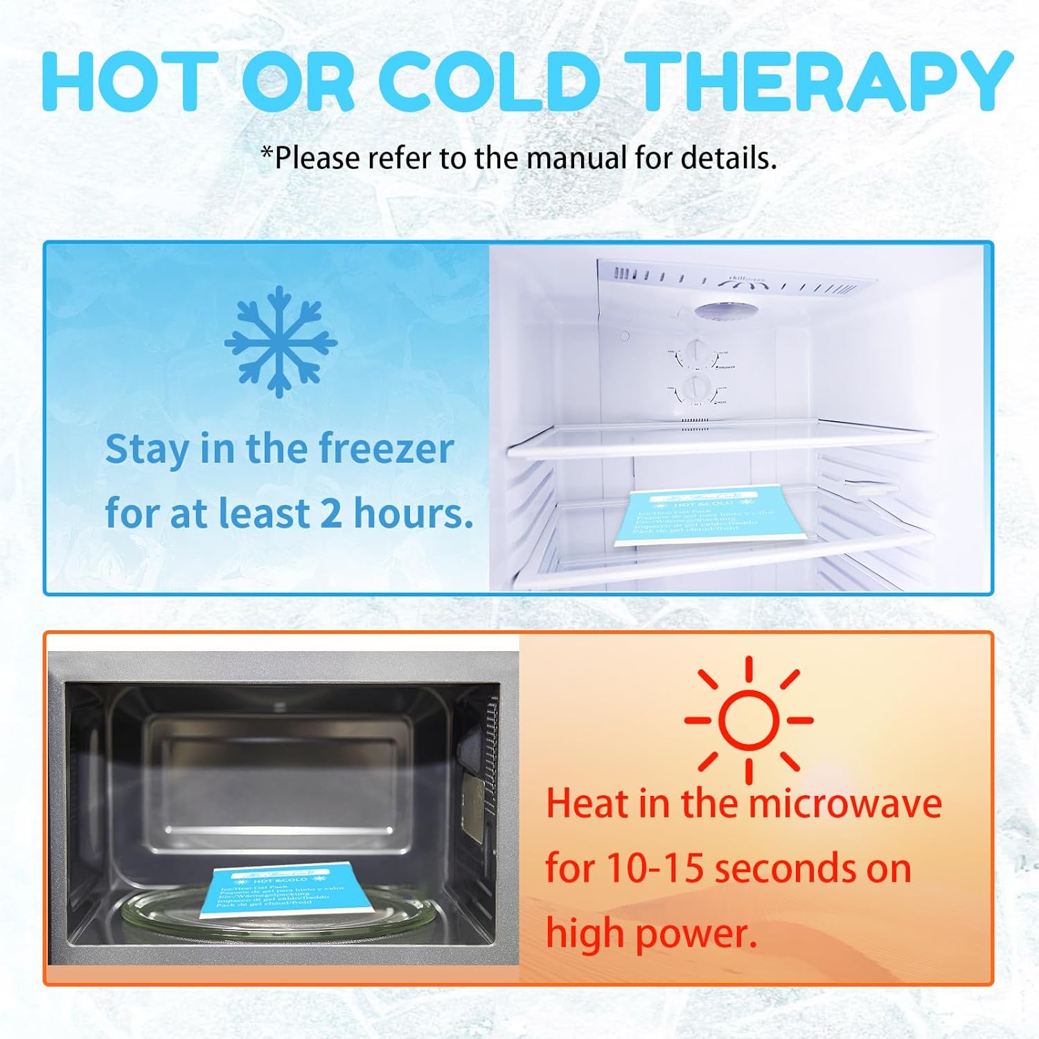 - EASY TO USE - Just a simple operation to achieve the effect. Place cold packs in the freezer for 20-30 minutes, or microwave within 12 seconds to reach desired temperature. Our casualty ice packs stay flexible when the ice pack freezes.