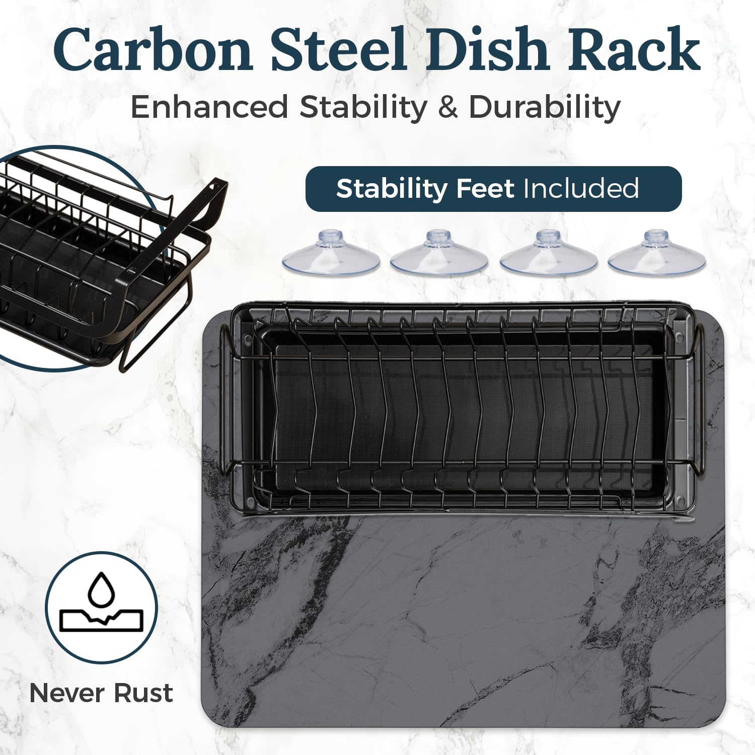 AquaTerra Diatomaceous Earth Drying Mat with Matching Sponge Caddy & Dish Rack | 3-Piece Set (Dark Gray Marble, Large) | Heat-Resistant & Multi-Purpose for Drying and Kitchen Organization