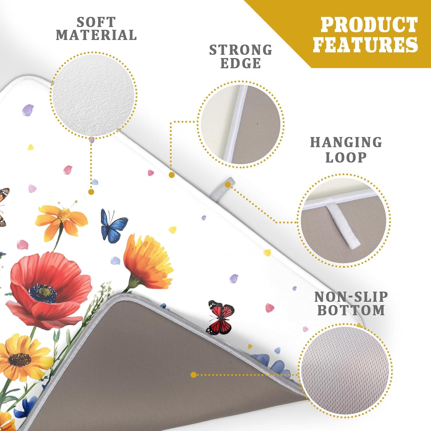 Watercolor Flower Dish Drying Mat 18x24 Inch Floral Butterfly Dish Drainer Protector Pad Washable Reversible Kitchen Counter Dish Dry Pad