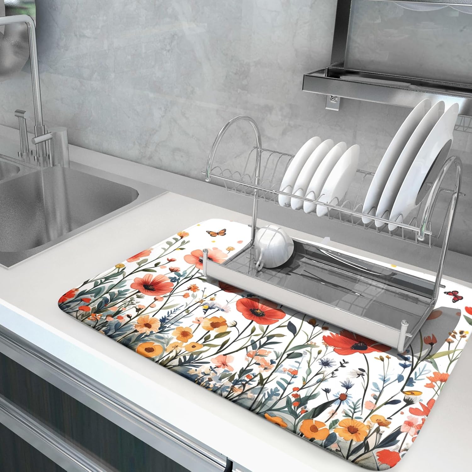 Poppy Flower Dish Drying Mat 18x24 Inch Floral Leaves Dish Drainer Protector Pad Washable Reversible Drying Pad for Kitchen Counter Sink