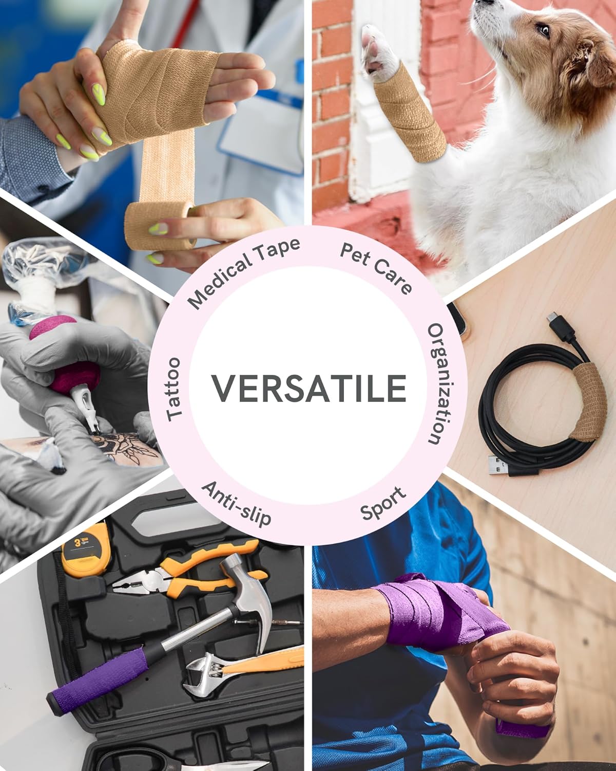 FriCARE Self Adhesive Bandage Wrap, Medical Tape in First Aid Kit, Cohesive Bandages for Wounds Sport Vet, 2 Inches X 5 Yards 6 Rolls, Elegant