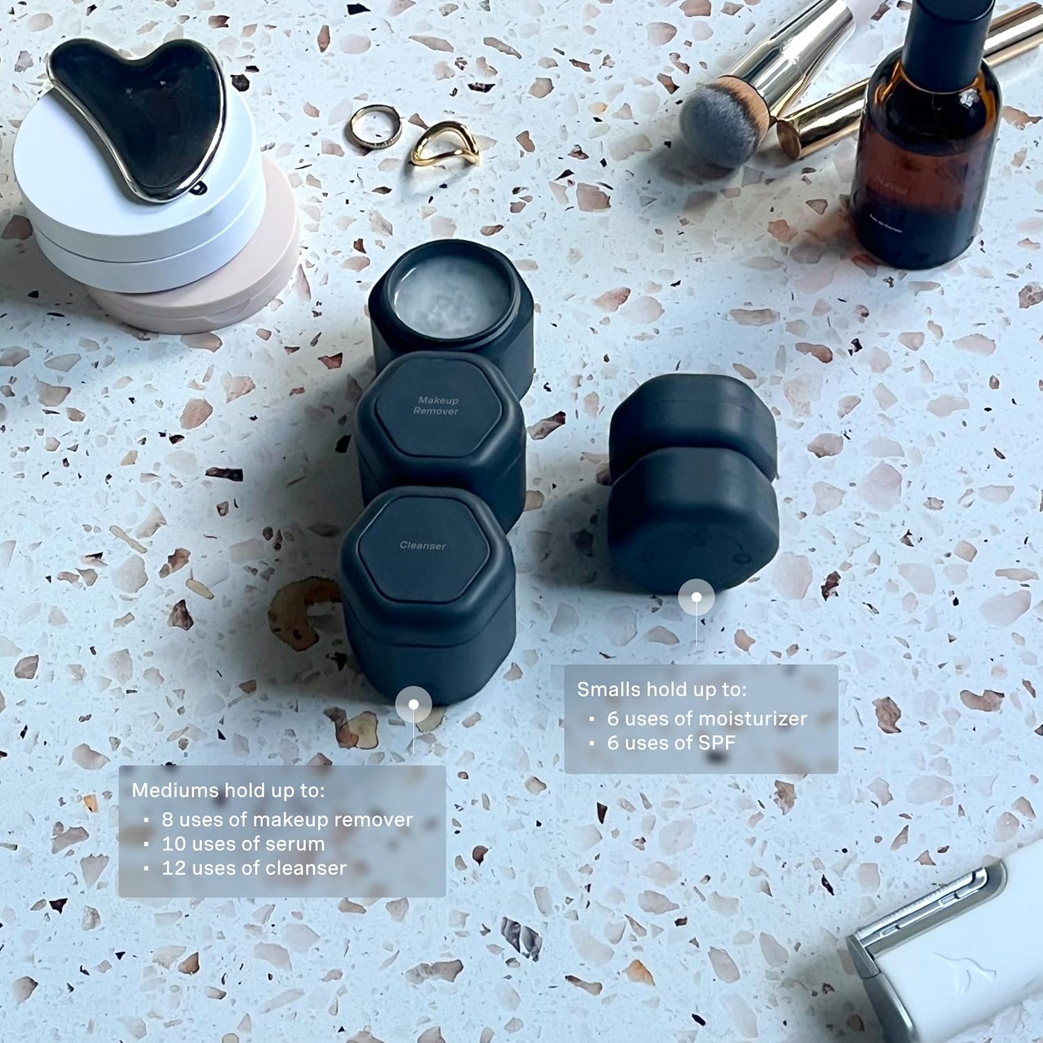 - PATENTED MAGNETIC DESIGN - Designed for seamless storage, our travel capsules feature a magnetic design that connects each container vertically or horizontally. They include magnetic labels that seamlessly swap between The Flex Small, The Flex Medium, and The Flex Large Capsules.