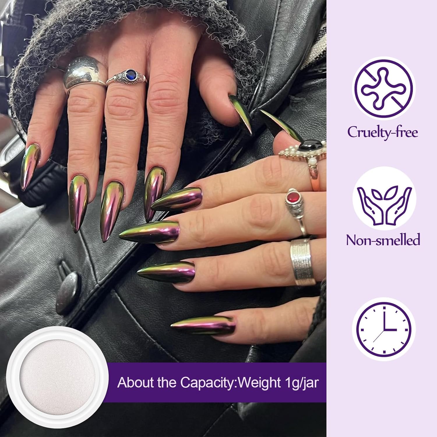 - 【PACKAGE CONTENTS】:16 pcs(each 1gram) Artdone Chrome Nail Powder, 2 for white based pearl nail pigment powders, 6 for Aurora chrome nail powder, 7 for mirror chrome powder, and 1 sliver holographic nail powder. They needs to be used with gel nail polish and no wipe top coat.