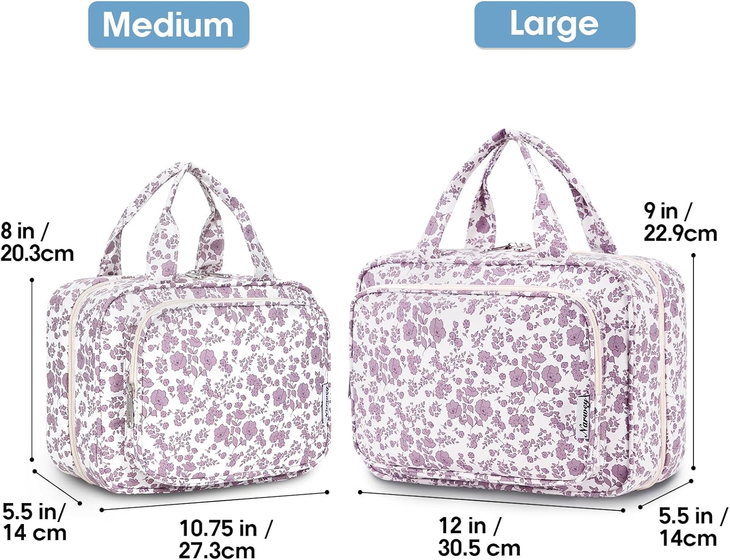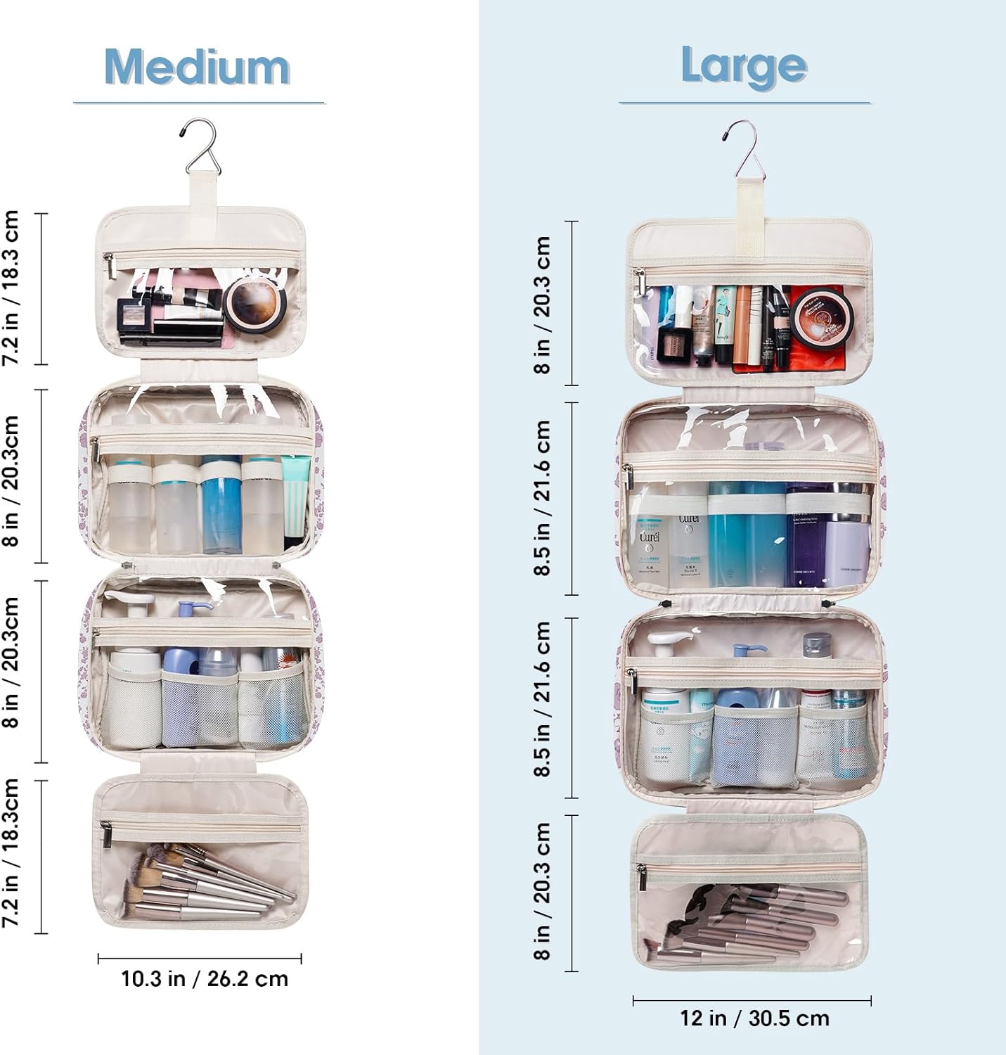 - LARGE VERSION - Fold size 12"x9"x5.5β/30.5x22x13 cm. We launch larger version to meet large-capacity, which you may choose large or medium size based on your needs. It could easily fit full-size travel essentials like shampoo & conditioner, lotion, face wash, toothpaste, toothbrushes, hair brush and daily makeups