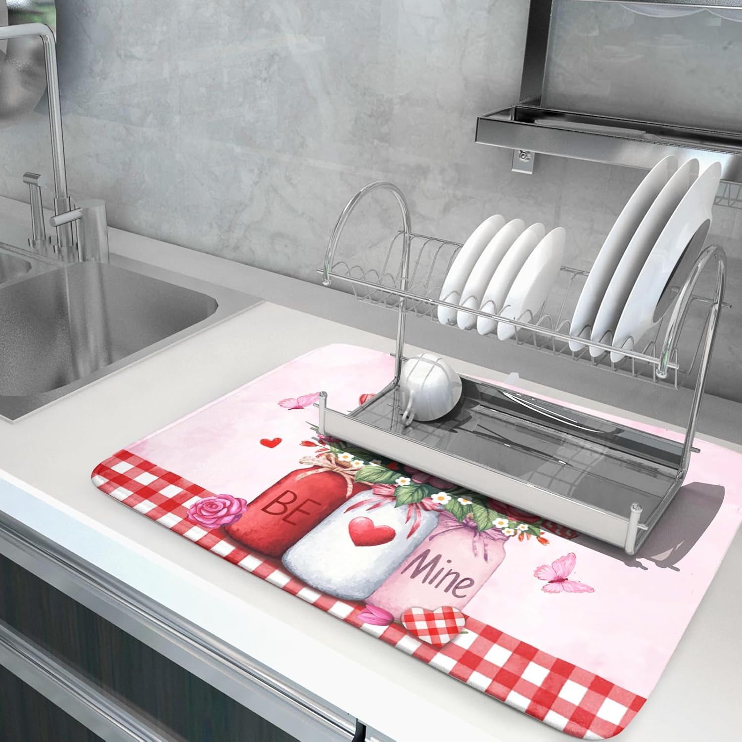 - 【Wide Usage】The dish drying mat designed with heart butterfly pattern, it is beautiful, soft, and durable. Not only a dish drying mat, cup mat, heat resistant mat, you can also use it as a kitchen countertop insulation mat. It is also a good choice to use it as a pet mat, picnic mat.