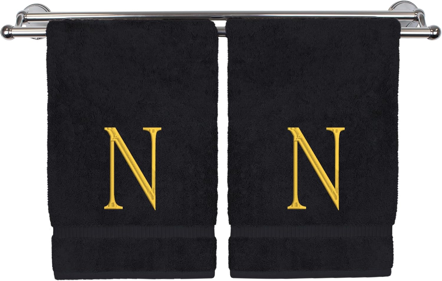 Monogrammed Hand Towel, Personalized Initial Gift, Extra Absorbent 100% Turkish Cotton - Soft Terry Finish - Set of 2 - Gold Block Initial N - Embroidered on Black Towels