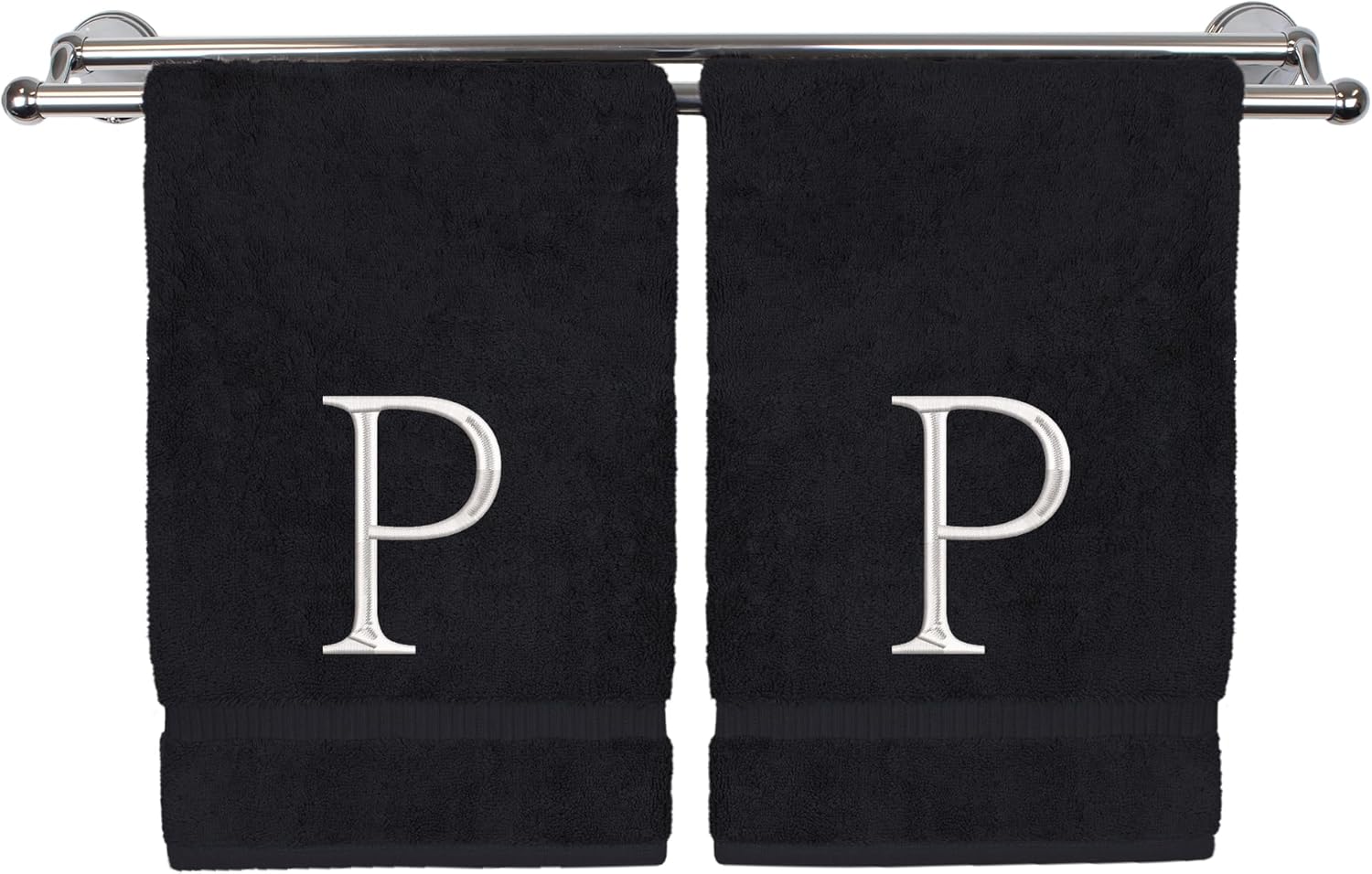 Monogrammed Hand Towel, Personalized Initial Gift, Extra Absorbent 100% Turkish Cotton - Soft Terry Finish - Set of 2 - White Block Initial P - Embroidered on Black Towels