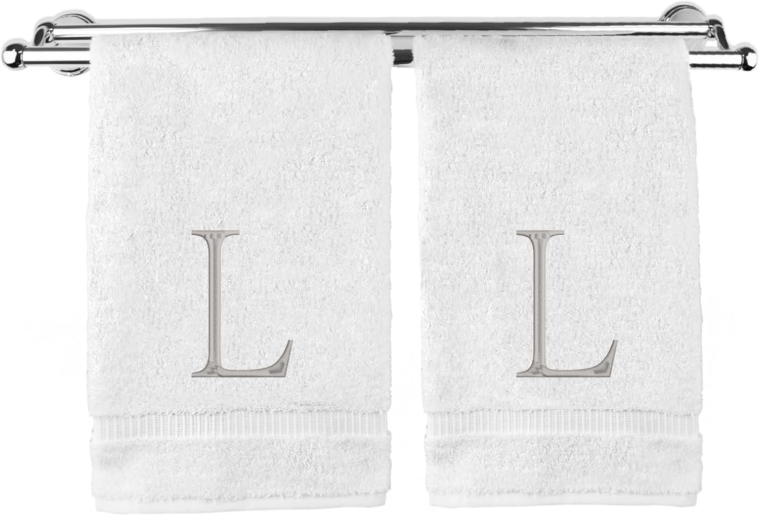 Monogrammed Hand Towel, Personalized Initial Gift, Extra Absorbent 100% Turkish Cotton - Soft Terry Finish - Set of 2 - Silver Block Initial L - Embroidered on White Towels