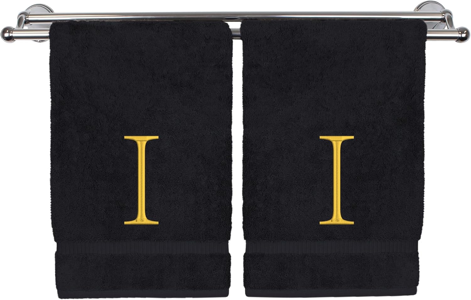 Monogrammed Hand Towel, Personalized Initial Gift, Extra Absorbent 100% Turkish Cotton - Soft Terry Finish - Set of 2 - Gold Block Initial I - Embroidered on Black Towels