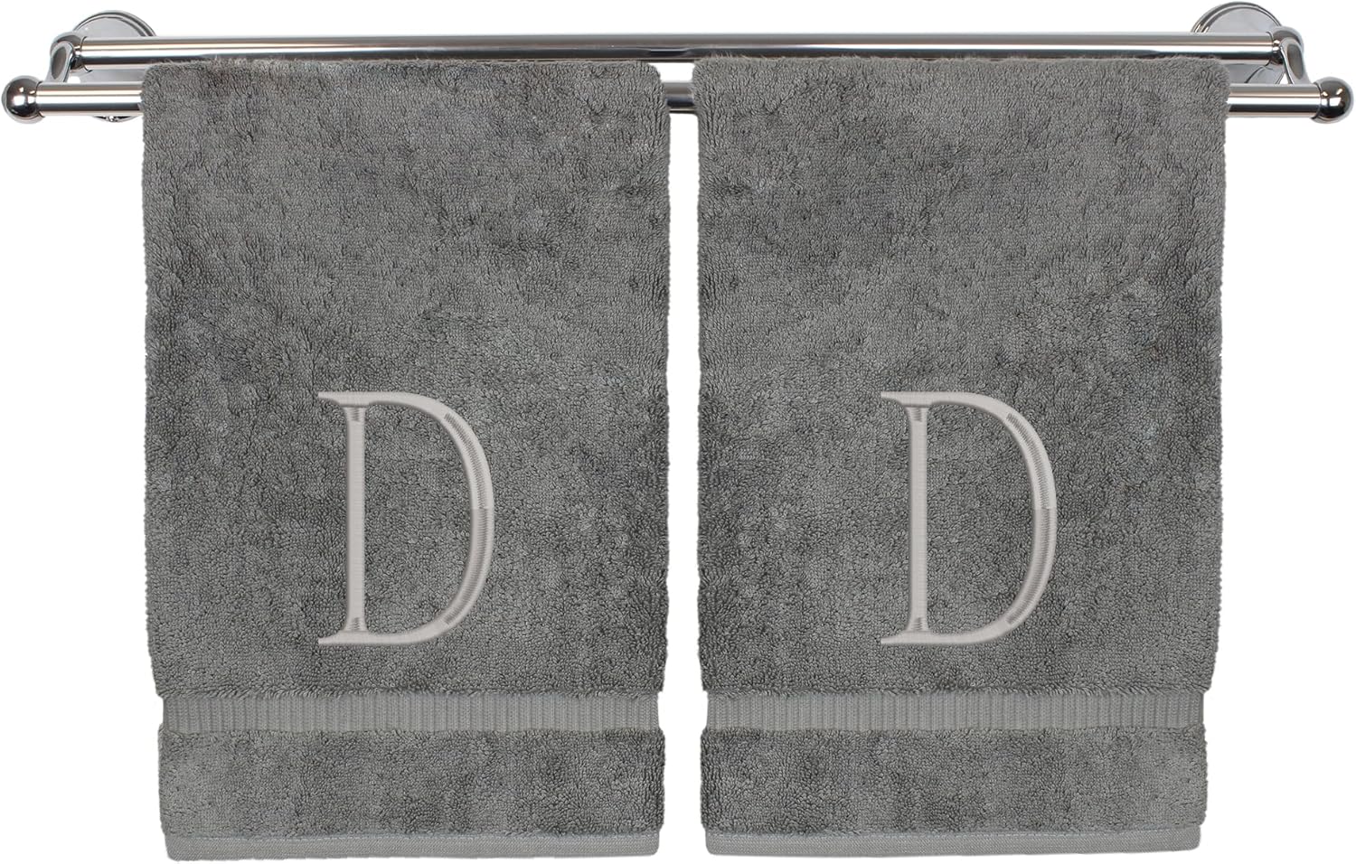 Monogrammed Hand Towel, Personalized Initial Gift, Extra Absorbent 100% Turkish Cotton - Soft Terry Finish - Set of 2 - Silver Block Initial D - Embroidered on Grey Towels