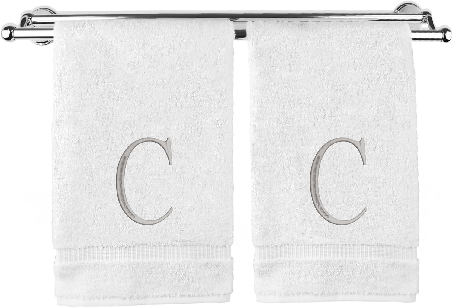Monogrammed Hand Towel, Personalized Initial Gift, Extra Absorbent 100% Turkish Cotton - Soft Terry Finish - Set of 2 - Silver Block Initial C - Embroidered on White Towels