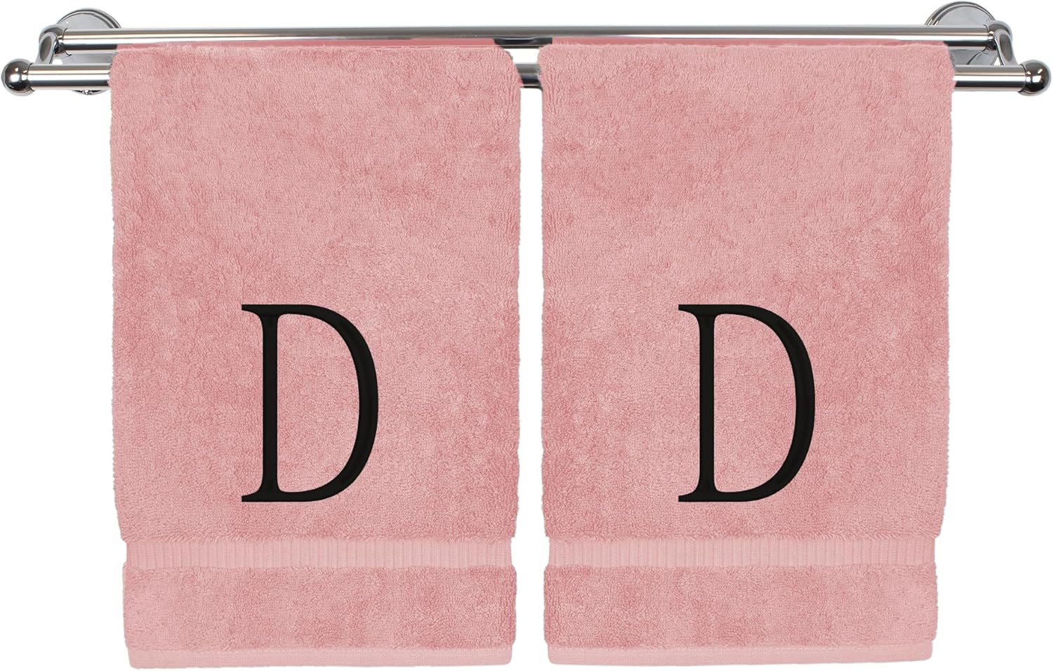 Monogrammed Hand Towel, Personalized Initial Gift, Extra Absorbent 100% Turkish Cotton - Soft Terry Finish - Set of 2 - Black Block Initial D - Embroidered on Pink Towels