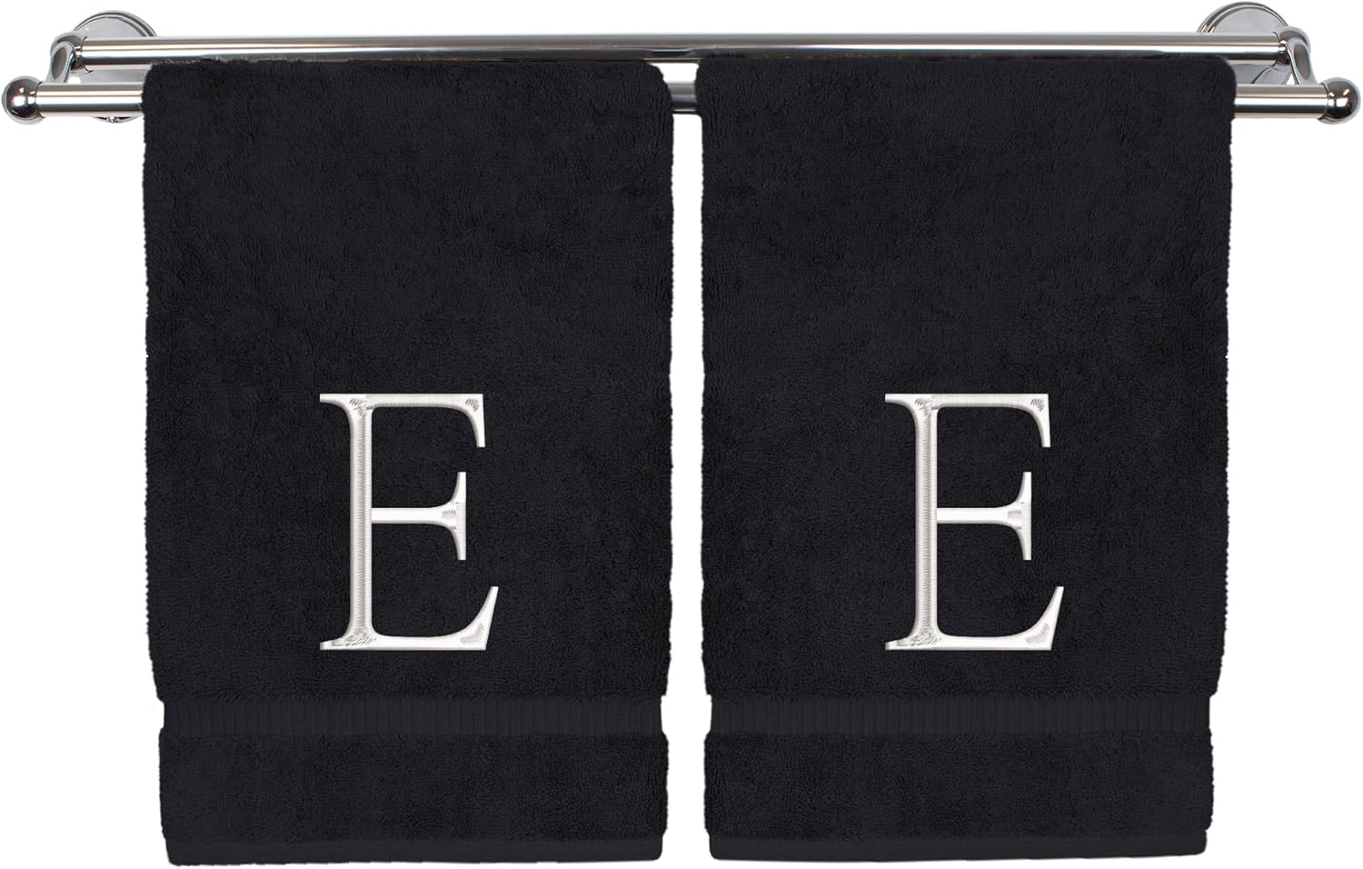 Monogrammed Hand Towel, Personalized Initial Gift, Extra Absorbent 100% Turkish Cotton - Soft Terry Finish - Set of 2 - White Block Initial E - Embroidered on Black Towels