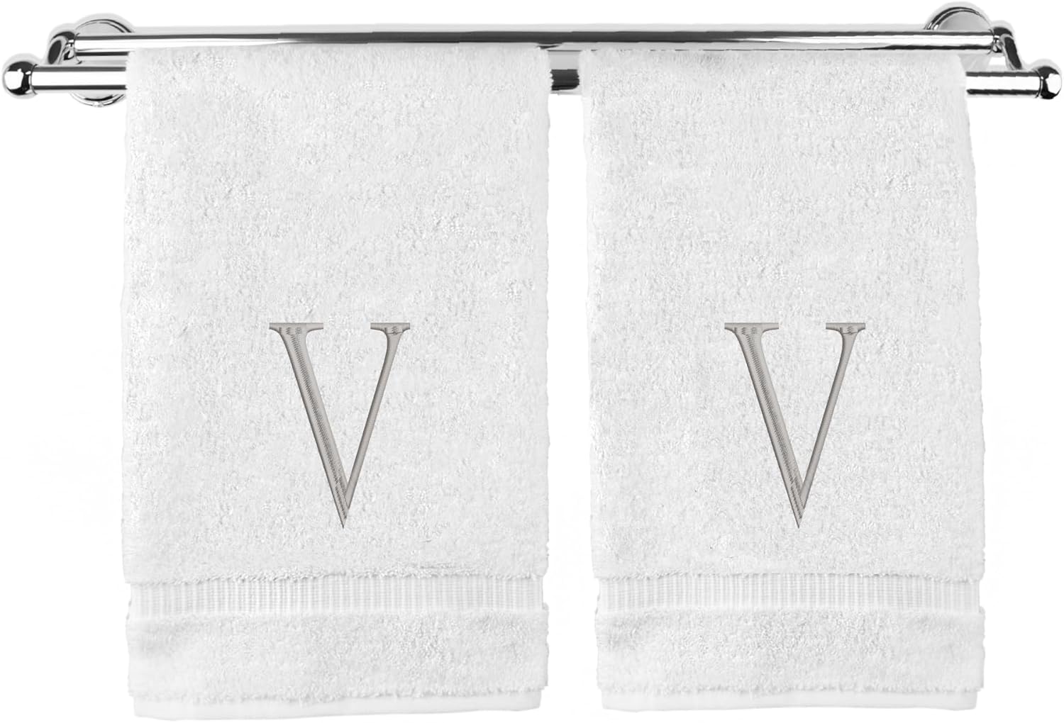 Monogrammed Hand Towel, Personalized Initial Gift, Extra Absorbent 100% Turkish Cotton - Soft Terry Finish - Set of 2 - Silver Block Initial V - Embroidered on White Towels