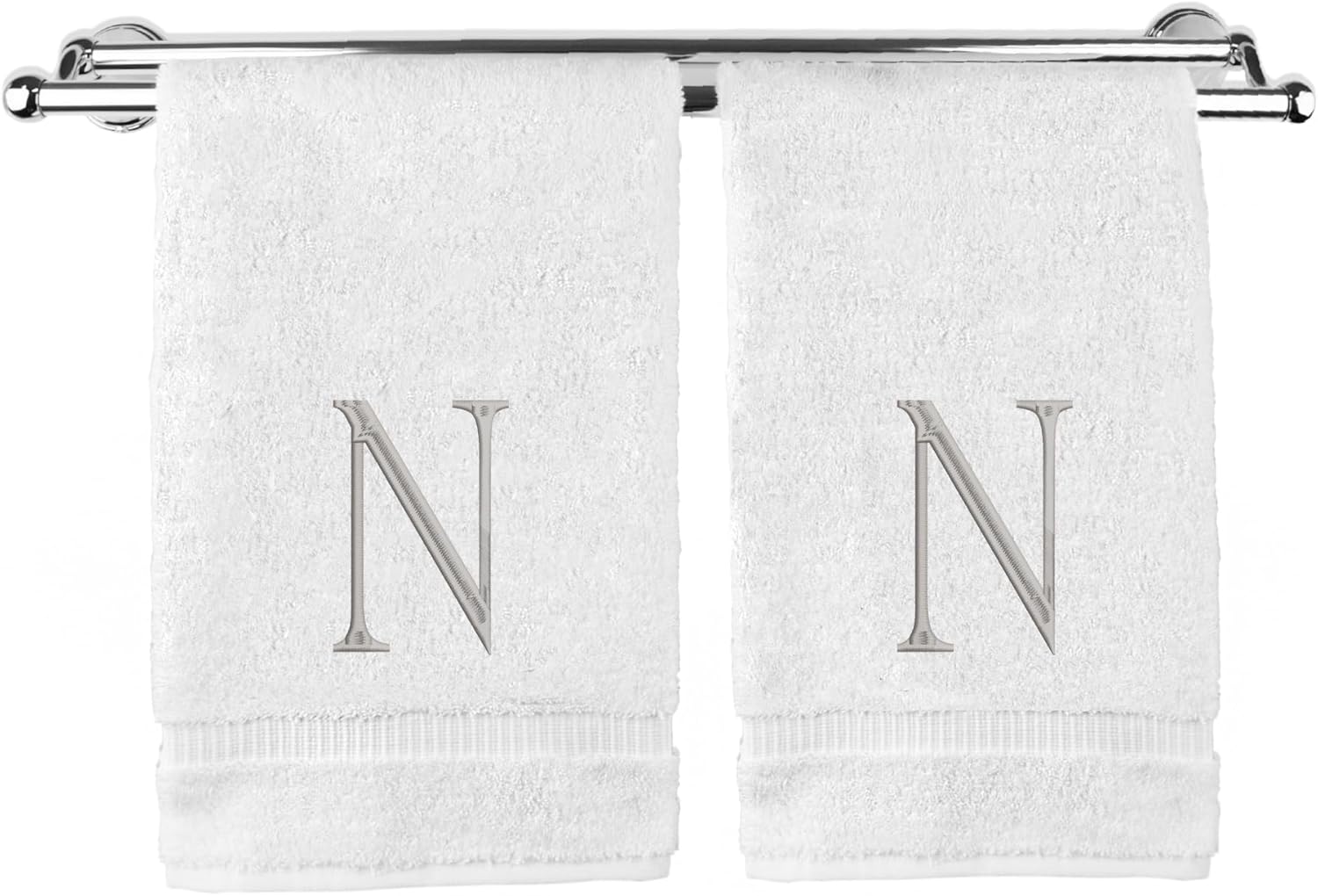 Monogrammed Hand Towel, Personalized Initial Gift, Extra Absorbent 100% Turkish Cotton - Soft Terry Finish - Set of 2 - Silver Block Initial N - Embroidered on White Towels