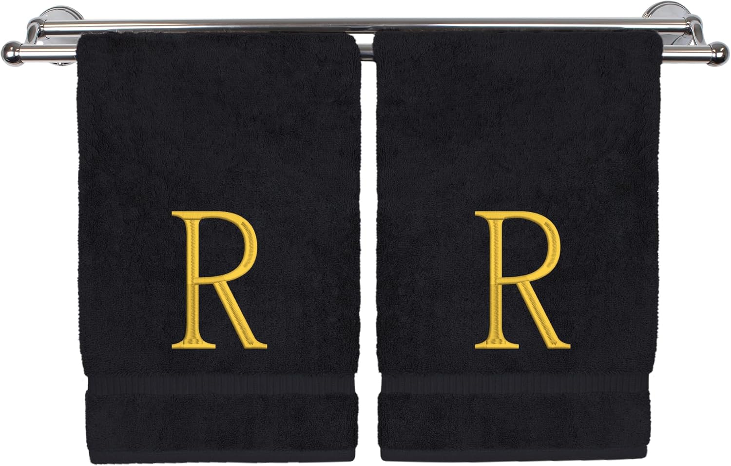 Monogrammed Hand Towel, Personalized Initial Gift, Extra Absorbent 100% Turkish Cotton - Soft Terry Finish - Set of 2 - Gold Block Initial R - Embroidered on Black Towels