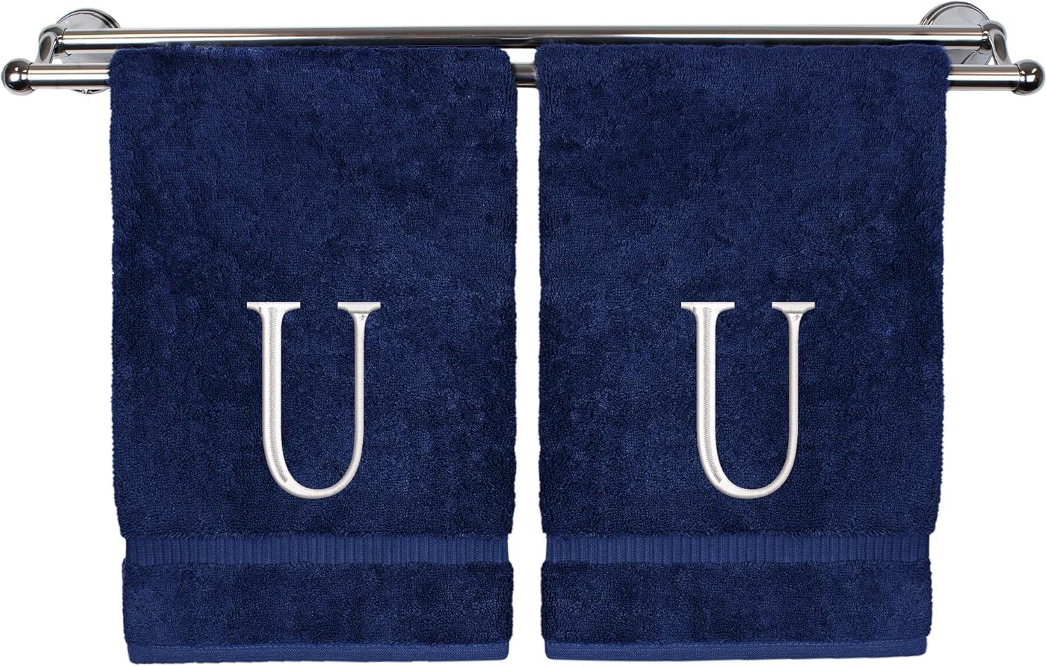 Monogrammed Hand Towel, Personalized Initial Gift, Extra Absorbent 100% Turkish Cotton - Soft Terry Finish - Set of 2 - White Block Initial U - Embroidered on Navy Blue Towels