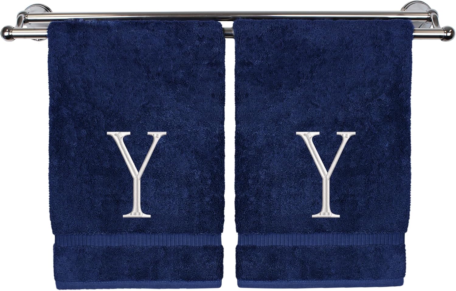 Monogrammed Hand Towel, Personalized Initial Gift, Extra Absorbent 100% Turkish Cotton - Soft Terry Finish - Set of 2 - White Block Initial Y - Embroidered on Navy Blue Towels