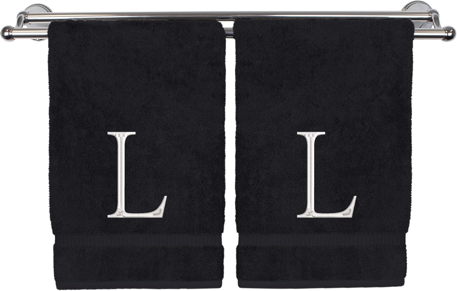 Monogrammed Hand Towel, Personalized Initial Gift, Extra Absorbent 100% Turkish Cotton - Soft Terry Finish - Set of 2 - White Block Initial L - Embroidered on Black Towels