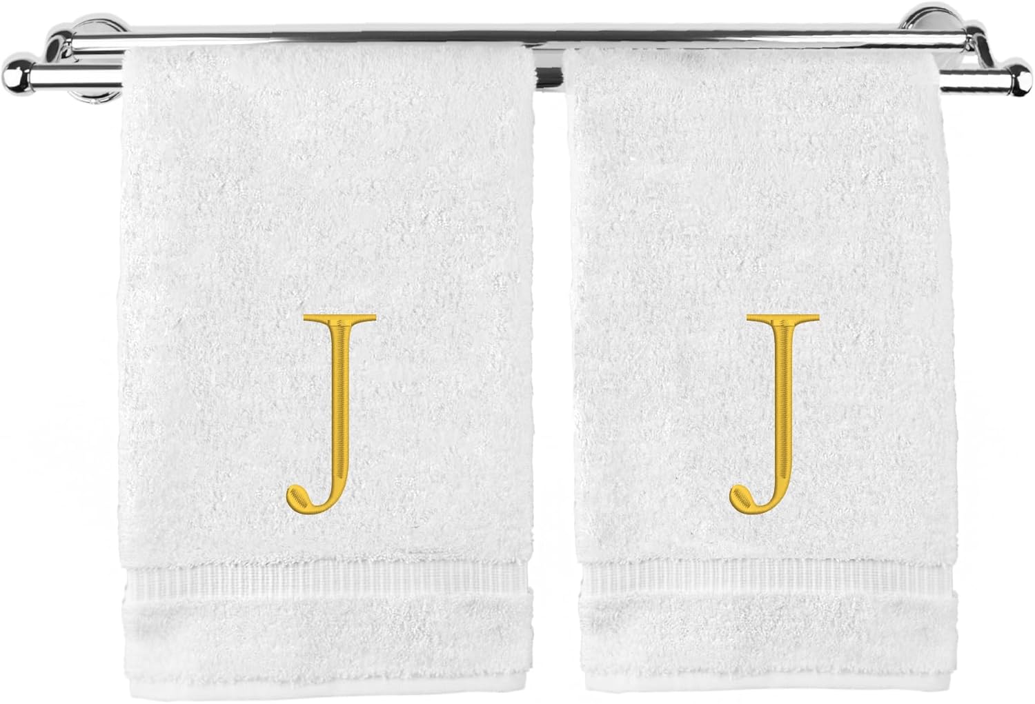 Monogrammed Hand Towel, Personalized Initial Gift, Extra Absorbent 100% Turkish Cotton - Soft Terry Finish - Set of 2 - Gold Block Initial J - Embroidered on White Towels
