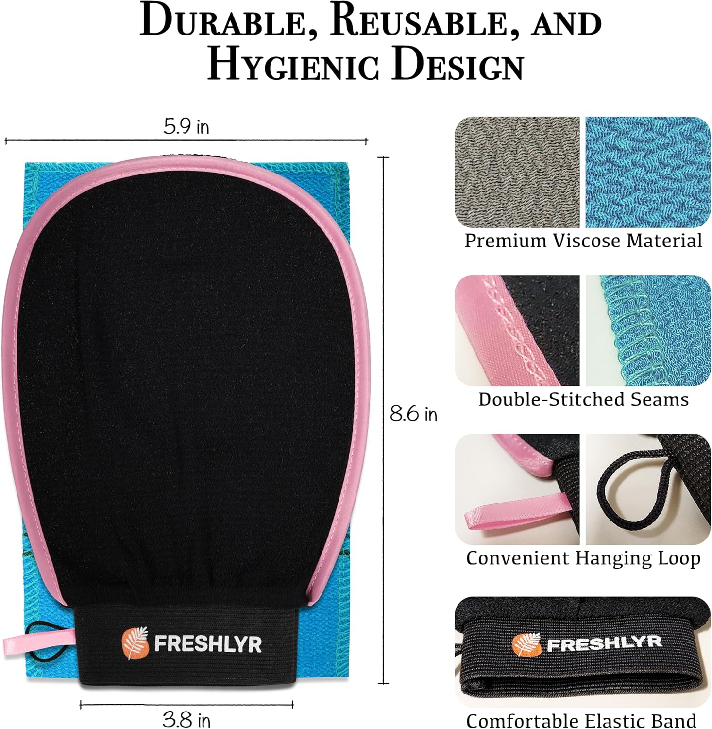 - Shower-Ready for All Skin Types - Crafted with premium materials, our Premium Exfoliating Mitts are reusable and feature double-stitched seams for added durability. Designed to fit comfortably on most hands thanks to their elastic wristband, the unique viscose fabric allows you to experience effective exfoliation. After use, a convenient loop allows you to hang the glove for hygienic air drying and easy storage.