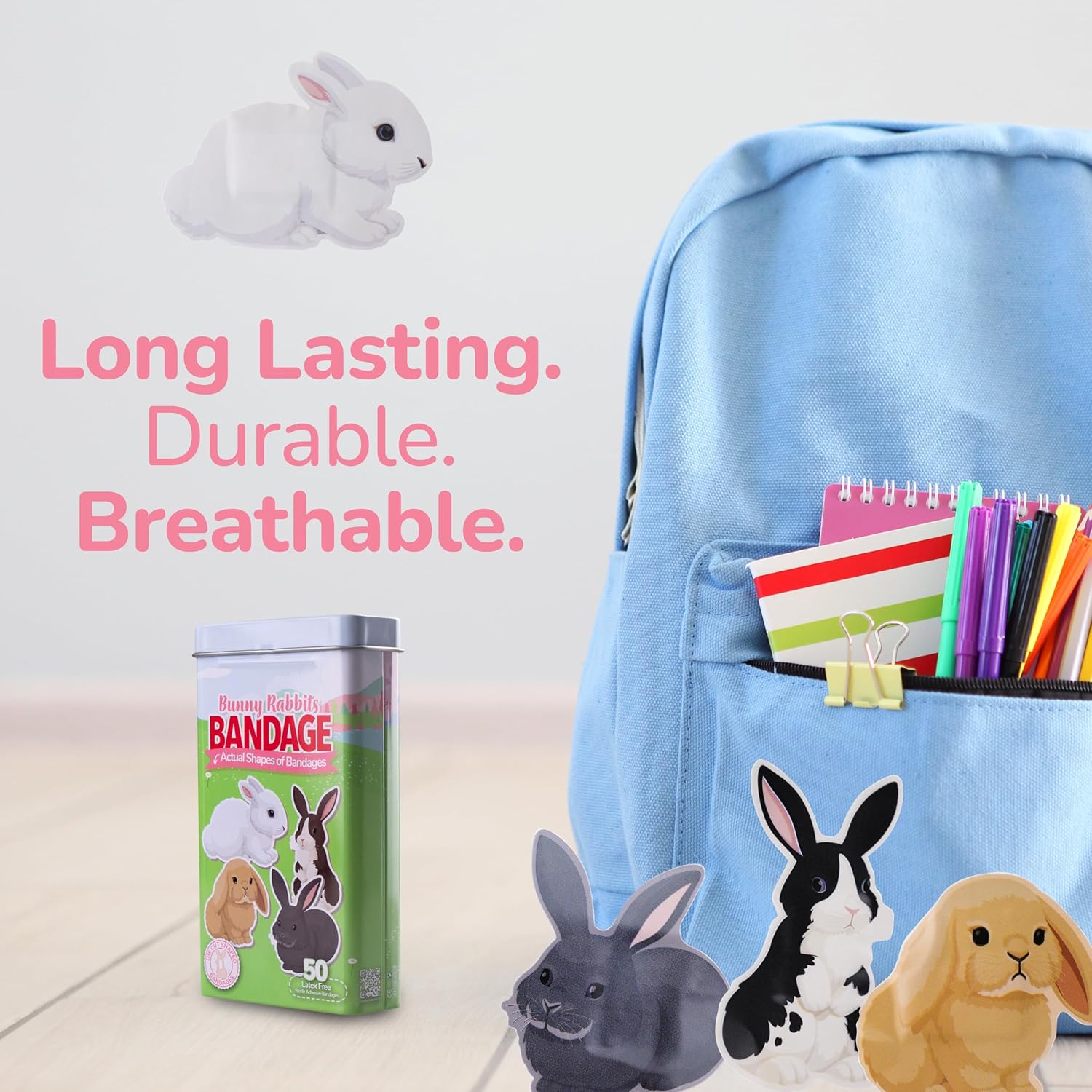 - 50 BUNNY KIDS BANDAGES: Fun bunny rabbit-shaped adhesive bandages tin helps protect cuts, scrapes, and minor wounds while making healing less stressful for children; bandages come in 4 assorted styles