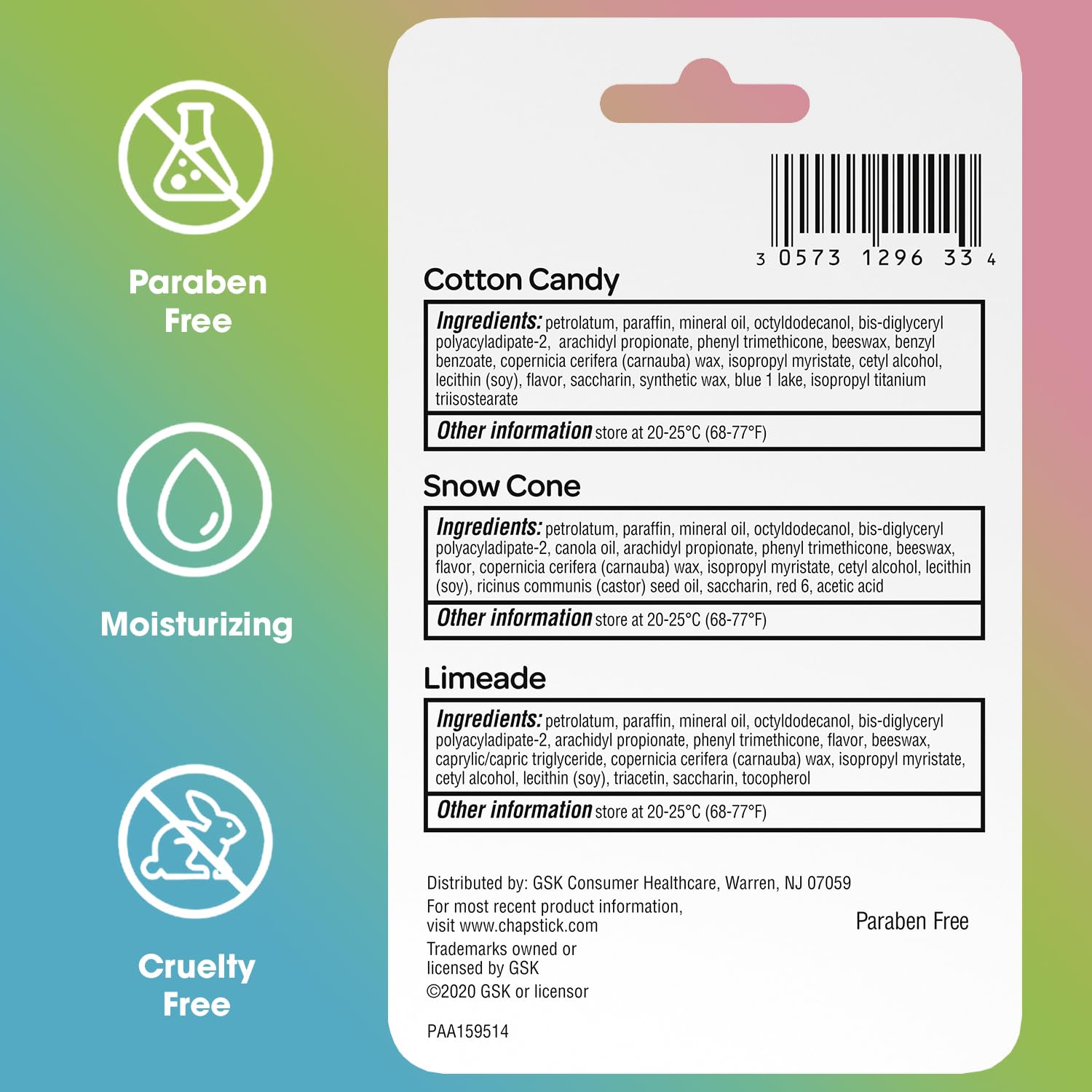 - CHAPSTICK FAN FAVORITES: Make every day more fun with twelve 3-packs of moisturizing lip balm sticks. Each set includes Snow Cone, Limeade, and Cotton Candy.