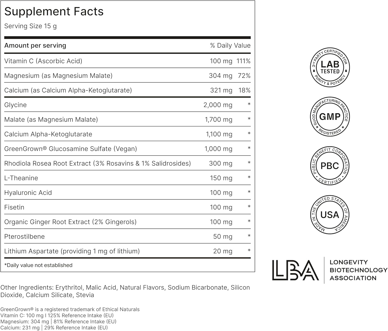 - NATURE-BASED: The ingredients we choose are found in food or human biology, and contains high-quality ingredients at the optimal dosages including magnesium, vitamin C, ginger, hyaluronic acid, L-Theanine, glycine, rhodiola rosea, fisetin, glucosamine sulfate, pterostilbene, calcium alpha-ketoglutarate, and magnesium malate to tackle multiple mechanisms of aging. NOVOS Core contains zero calories and sugar, is all-natural, vegan, and gluten-free, 3rd party tested and manufactured in the USA.