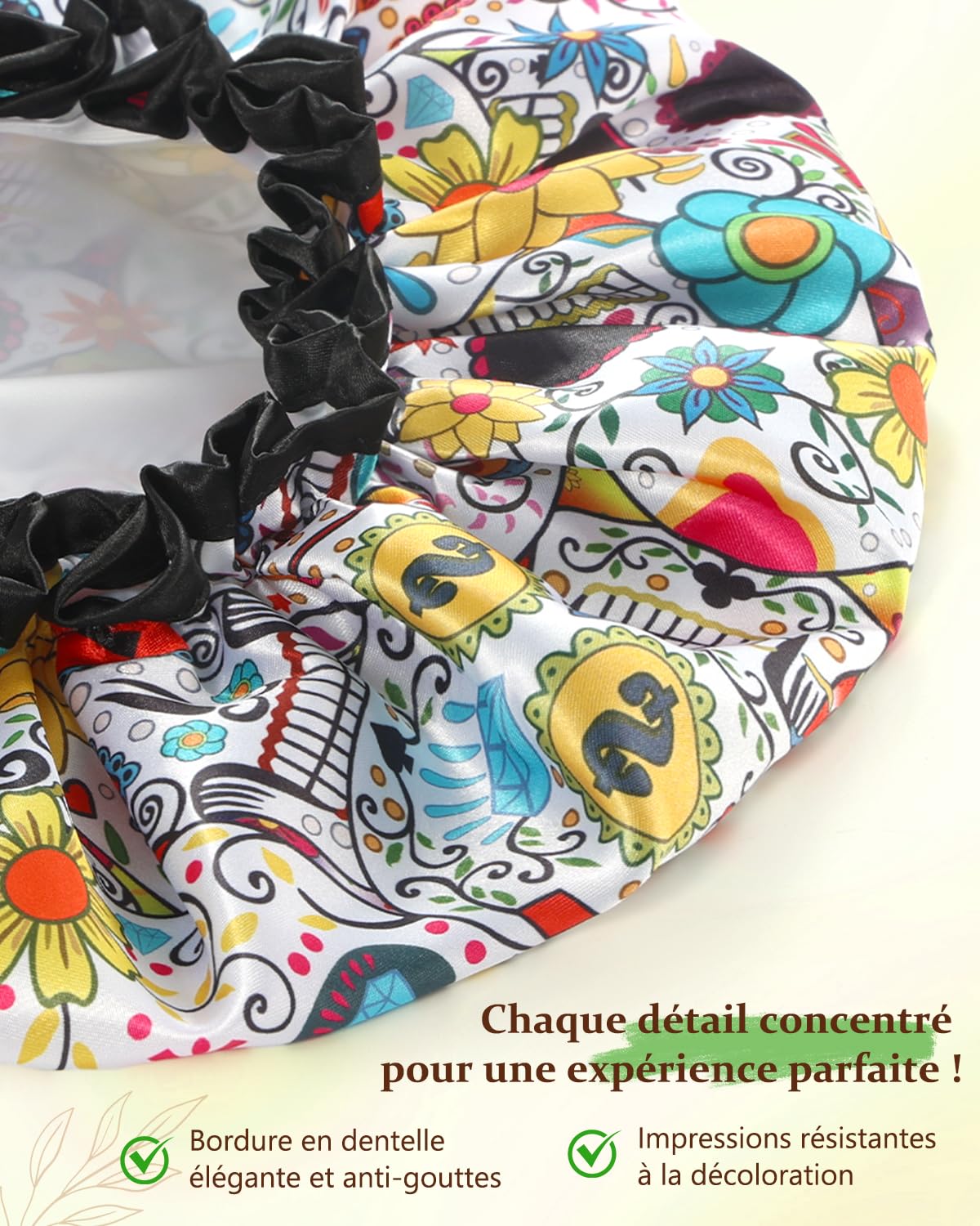 - A Splash of Fun for Showers: Add some flair to your daily routine with our vibrant sugar skull shower cap. Bursting with playful, colorful designs, it’s here to bring a little joy to every wash. Keep your hair dry while showing off your personality—because who says a shower cap can’t be fun? Go ahead, give your bath time a pop of character—you’ve earned it!