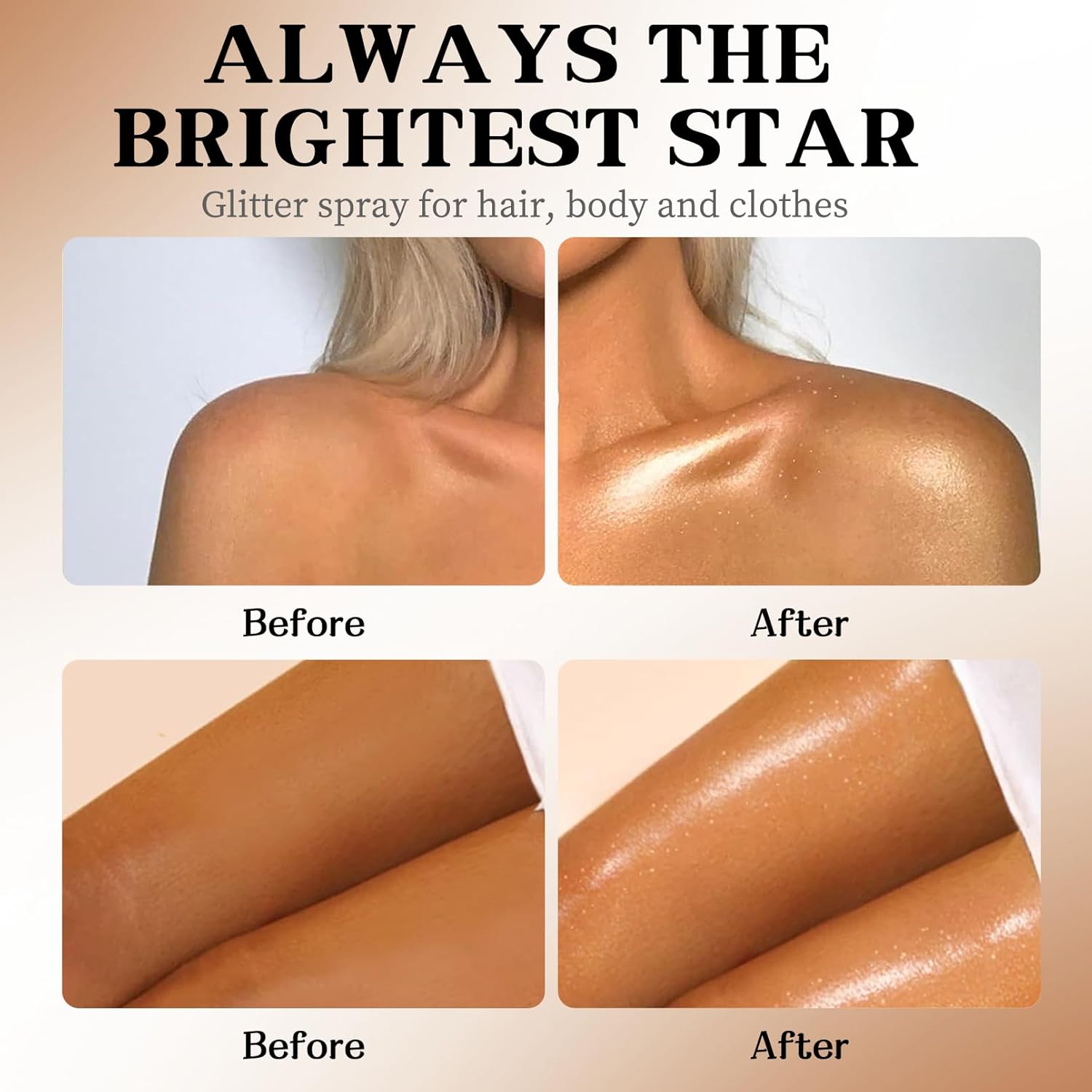 - Multi-Purpose Glitter Spray: Our body glitter spray is made of glitter particles, delivering a charming shimmer effect. You can spray it on your body, hair, face, skin, and even clothes. It will make you the center of attention under the lights at parties or nightclubs