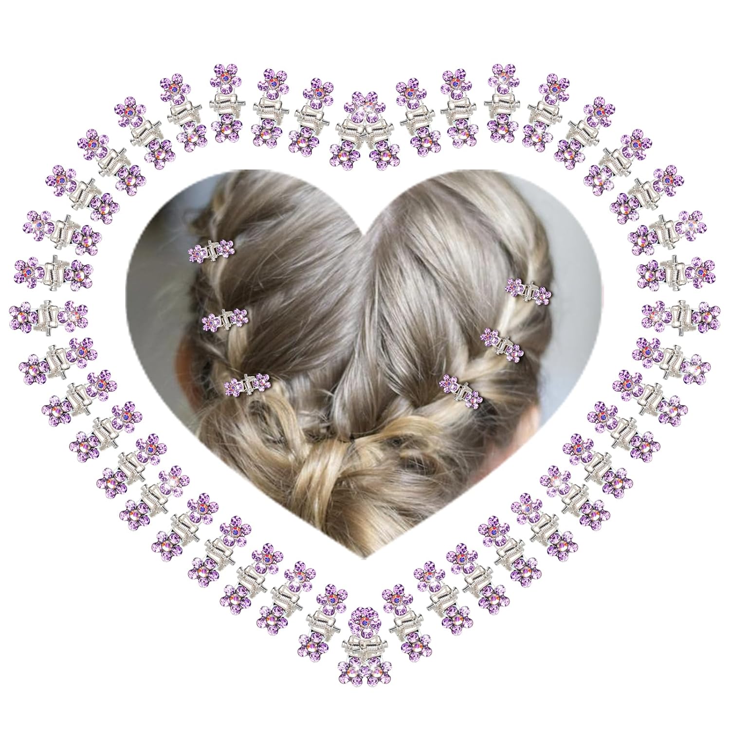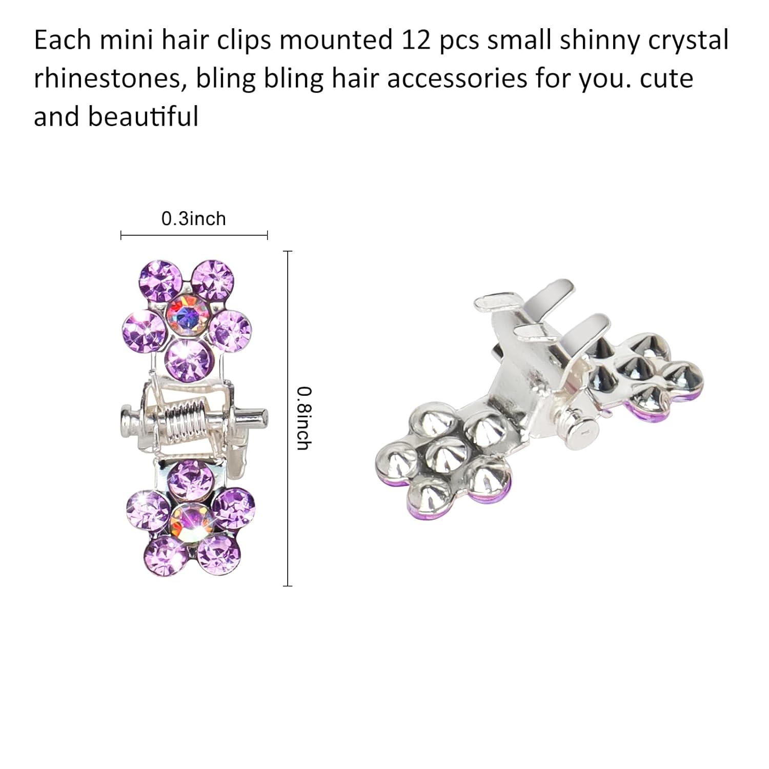 65PCS Mini Purple Flower Hair Clips with Rhinestone Mini Glitter Teeth Rhinestone Flower Hair Accessories No-Slip Grip Metal Jaw Clamps for Girls Women (Silver-Purple Crystal)