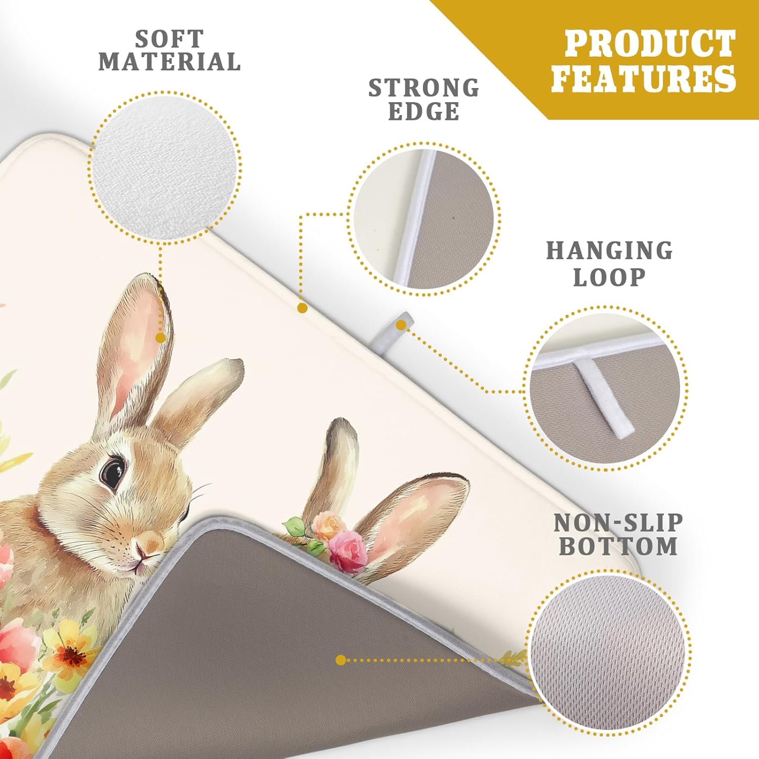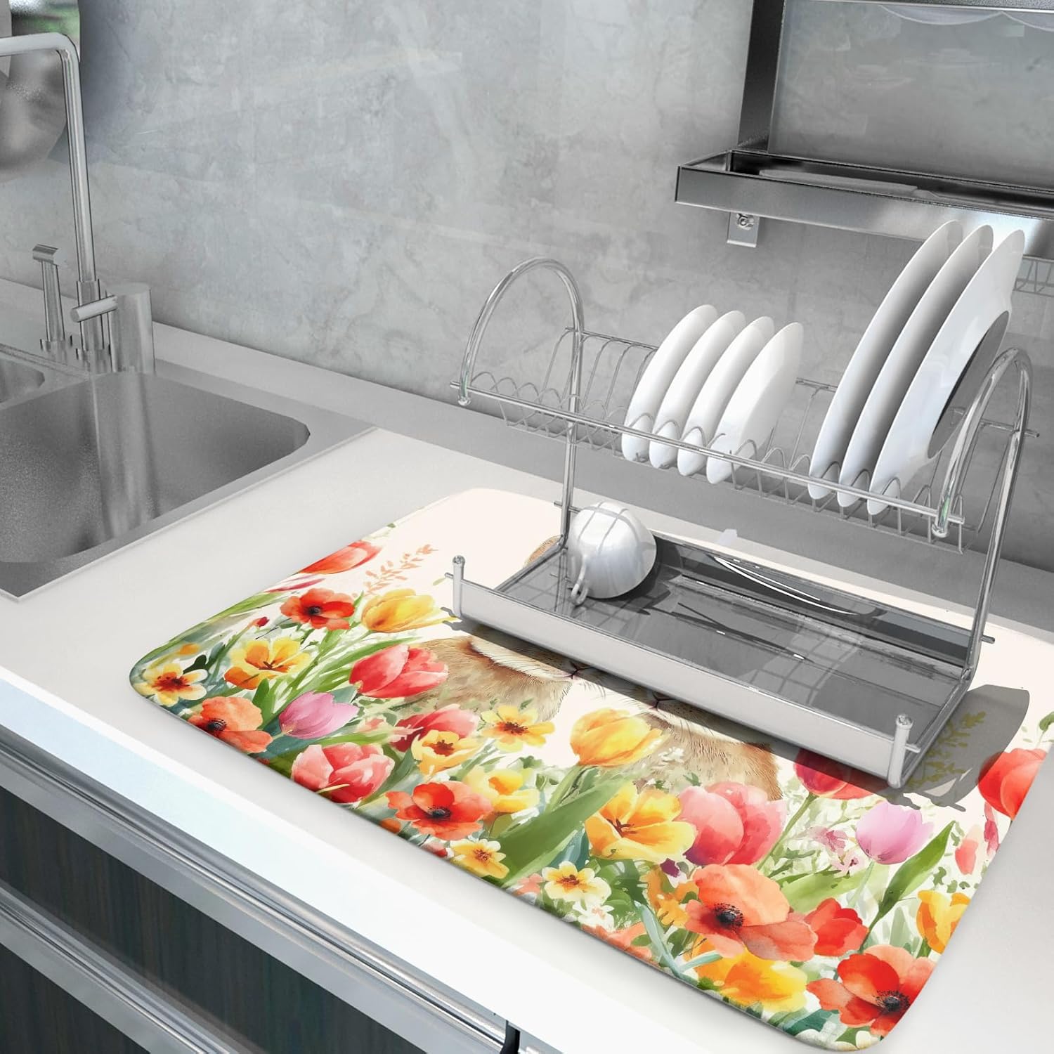 Easter Bunny Dish Drying Mat 18x24 inch Spring Floral Drying Pad Holiday Absorbent Microfiber Dishes Drainer Protector for Kitchen Counter