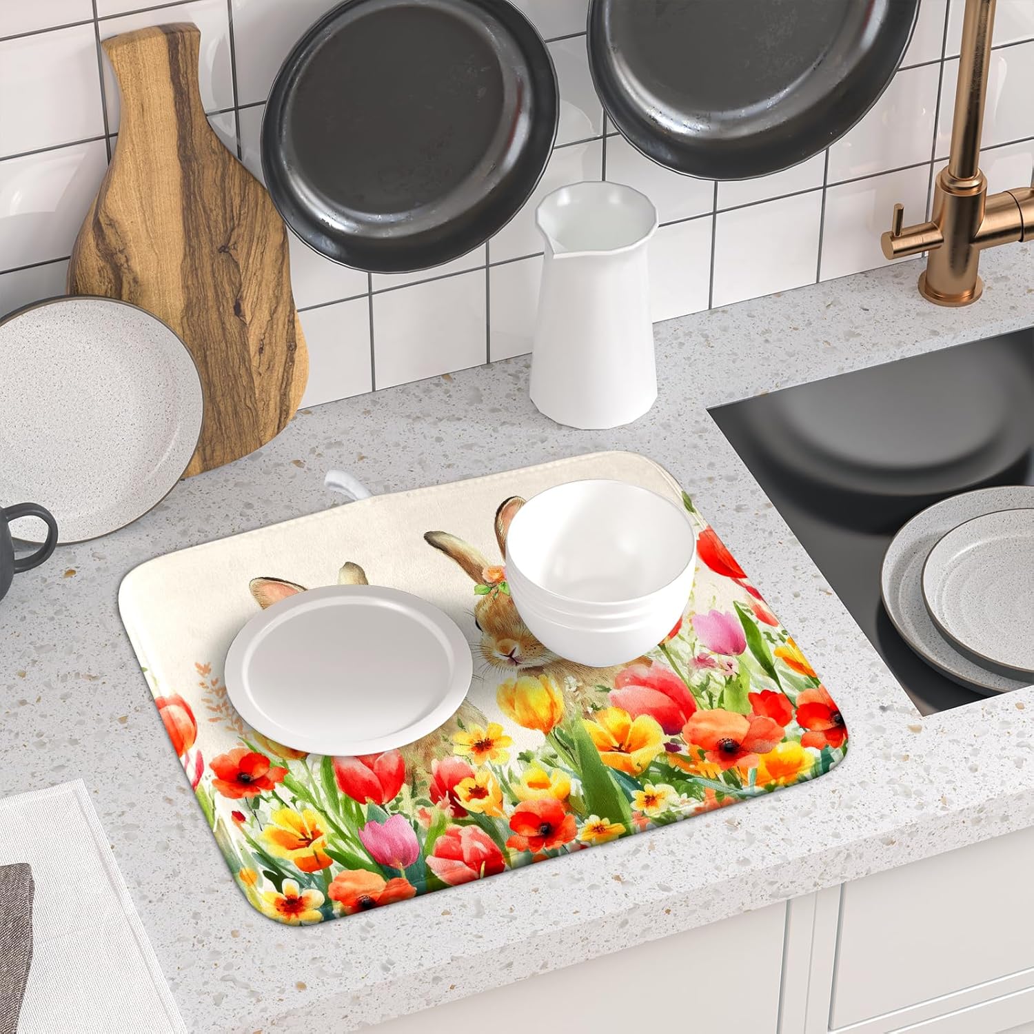 Easter Bunny Dish Drying Mat 16x18 inch Spring Floral Drying Pad Holiday Absorbent Microfiber Dishes Drainer Protector for Kitchen Counter