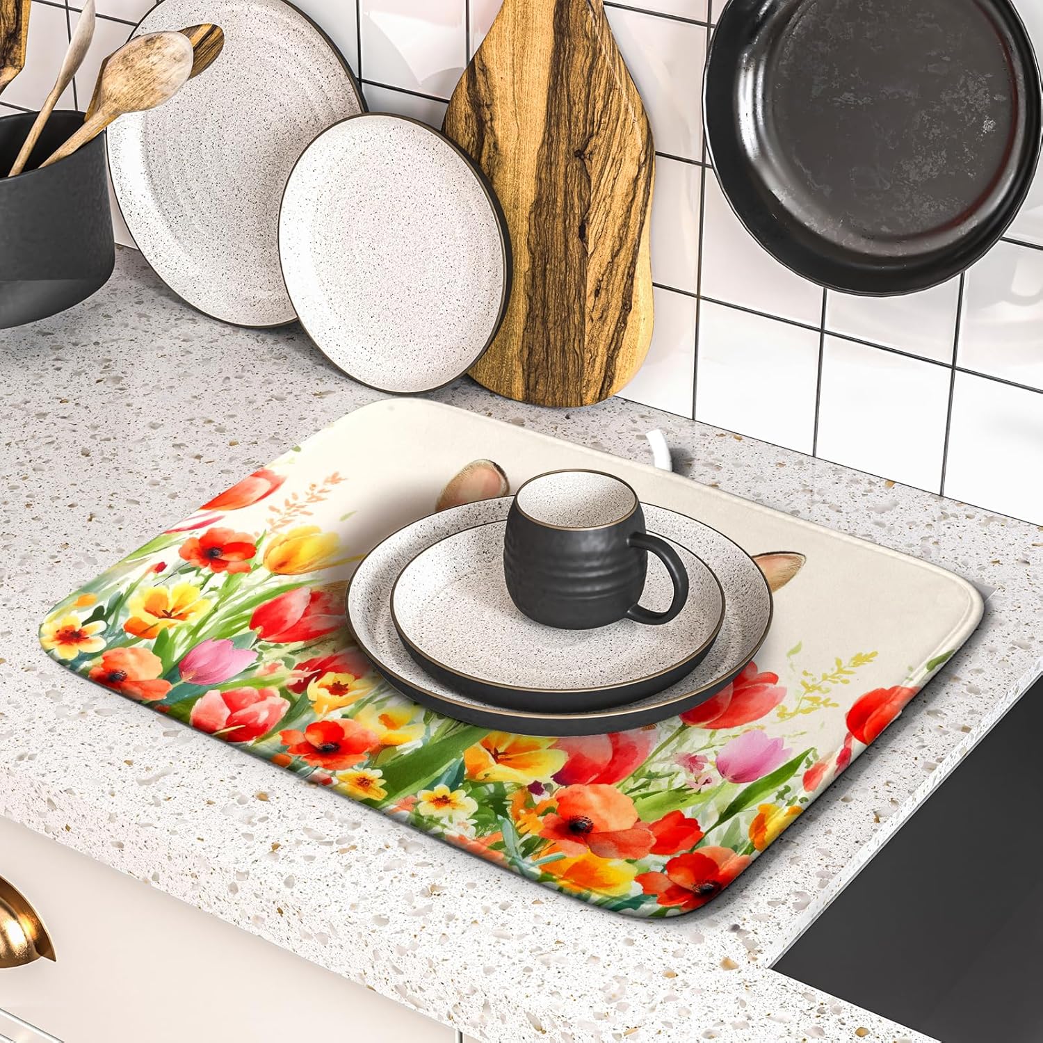 - 【Protect Tableware】Place your dishes on it or under dish racks, the watercolor floral dish mat prevents bowls, glassware, and more tablewares from being scratched or worn, can be used as dish drying mat, sink mat, dishes drainer mats to keep the countertop dry and tidy.