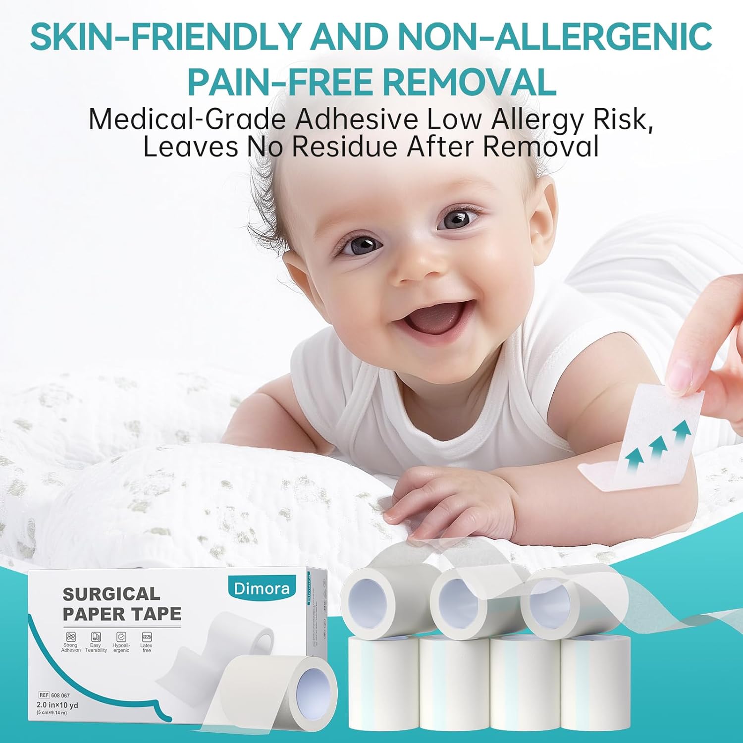 Dimora Soft Paper Surgical Tape 8 Rolls- Hypoallergenic Medical Tape for Sensitive Skin,Breathable First Aid Wound Tape with Pain-Free Removal, Secures Dressing and Medical Devices -2" x 10 Yards
